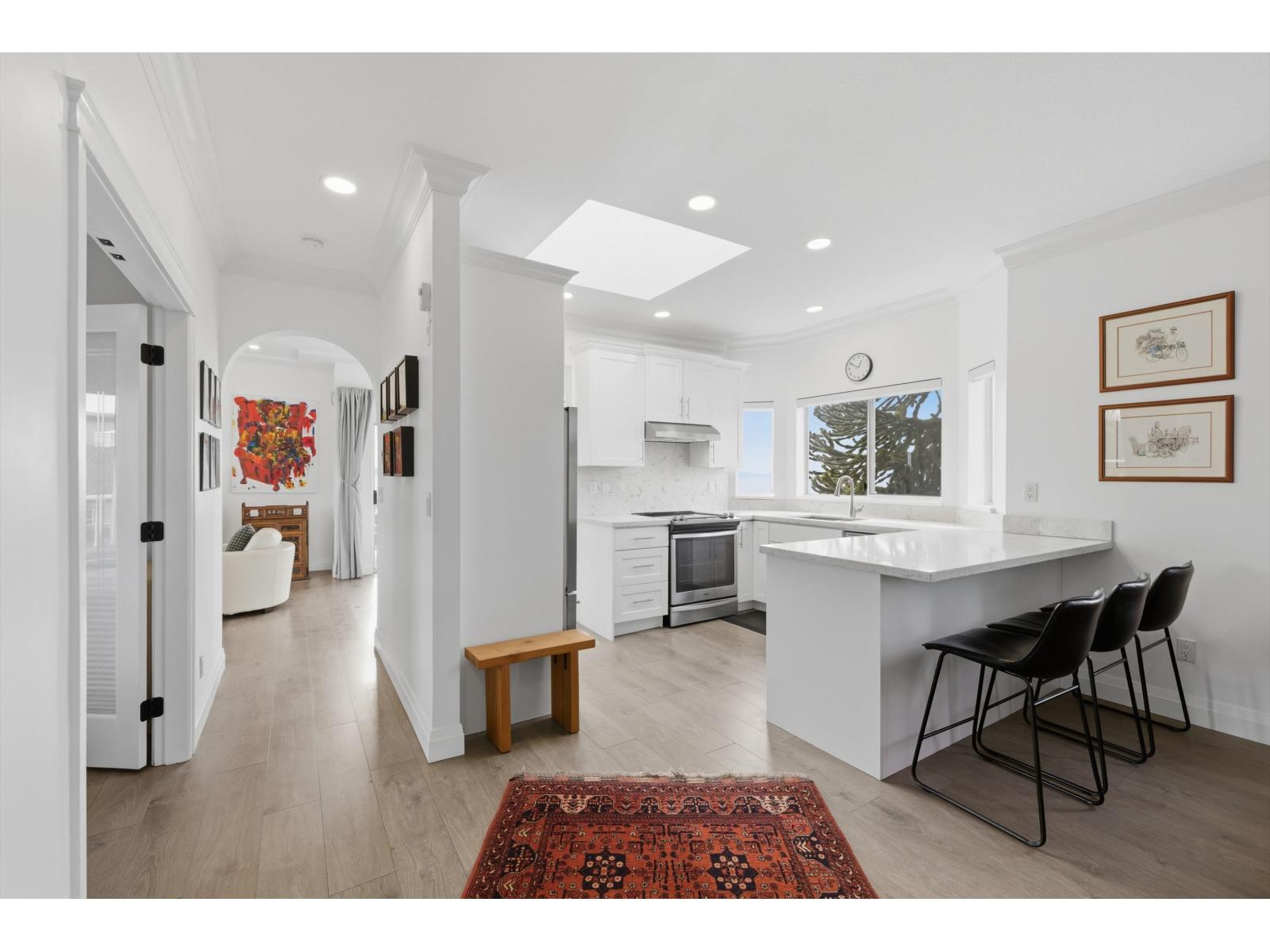 | RARE Ocean view penthouse. This bright, meticulously cared for residence is absolutely stunning and occupies the entire south end of a boutique building, 2 balconies south and west facing. Completely renovated in 2021, 2 bed/2 bath, formal living and dining areas with gas fireplace. The kitchen is opening to a comfortable family room-ideal for everyday living and entertaining. The spacious primary bedroom includes a deluxe ensuite with soaker tub, separate shower, walk-in closet. Check out the amazing floorplan. Very well-maintained, self-managed 55+ Strata. Roof done 2010, boiler in 2015, and exterior paint and sealing completed in 2016. 1 indoor cat allowed. Prime location, walkable to all; Five Corners, uptown shopping, restaurants, doctors and the beach. (id:5347) | |||