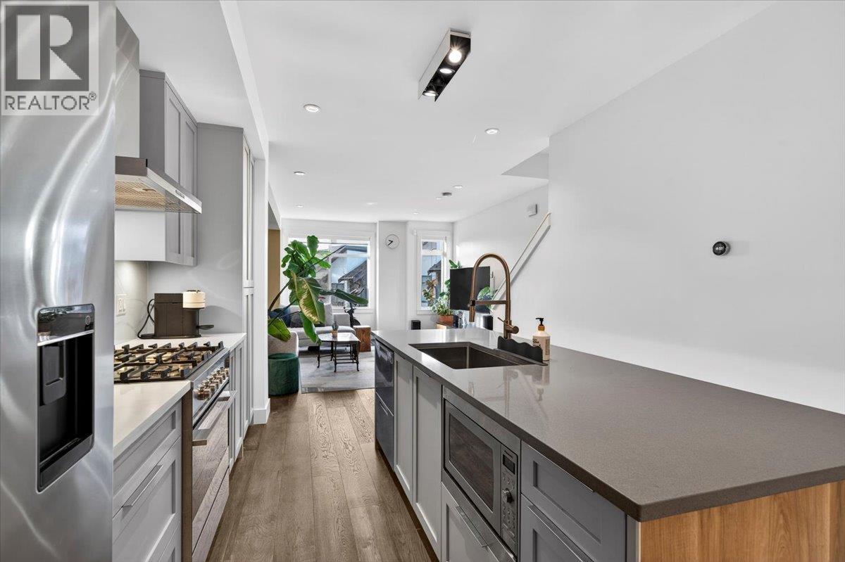 Rare townhome opportunity featuring a 375 square ft private rooftop deck with breathtaking views and approval for a rooftop hot tub. A fenced backyard garden on the main floor offers a safe space for children and pets. Bright open-concept layout with contemporary design and abundant natural light. Stunning kitchen showcases a large island, quartz countertops, farmhouse sink, custom cabinetry, and high-end appliances, includes air conditioning. Spacious primary bedroom easily fits a king-size bed . Parking for two vehicles plus one extra uncovered stall and EV charger. Situated in a quiet neighbourhood near future Burke Mountain Village and recreation complex, with easy access to transit, parks, trails, cafes, and shops-this home truly has it all. (id:5347)