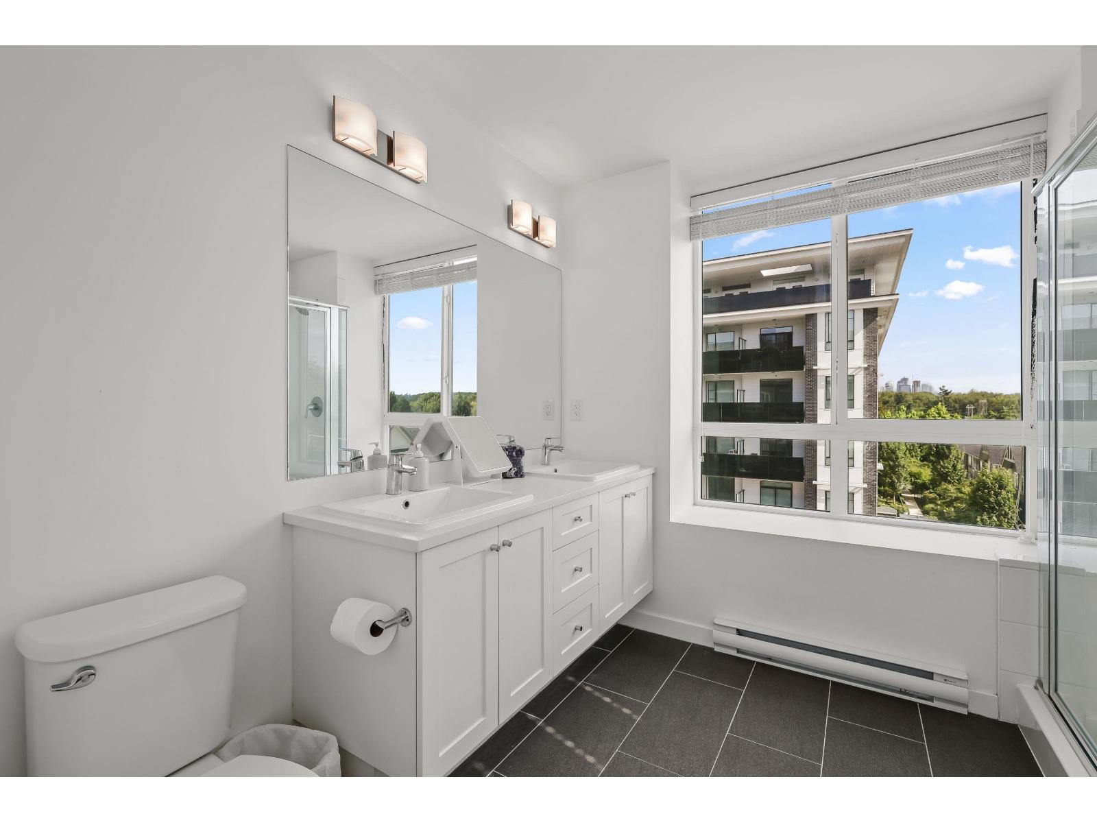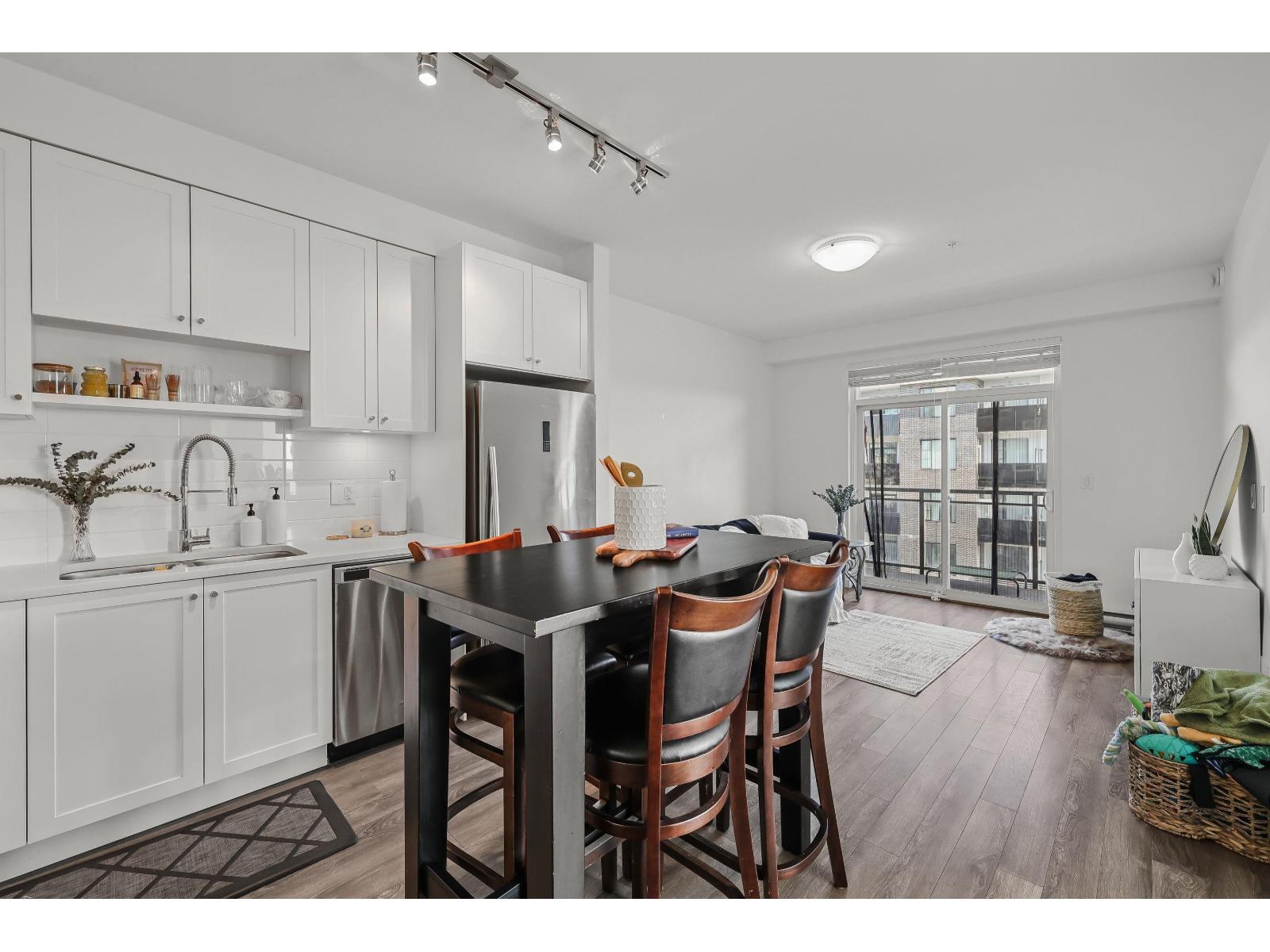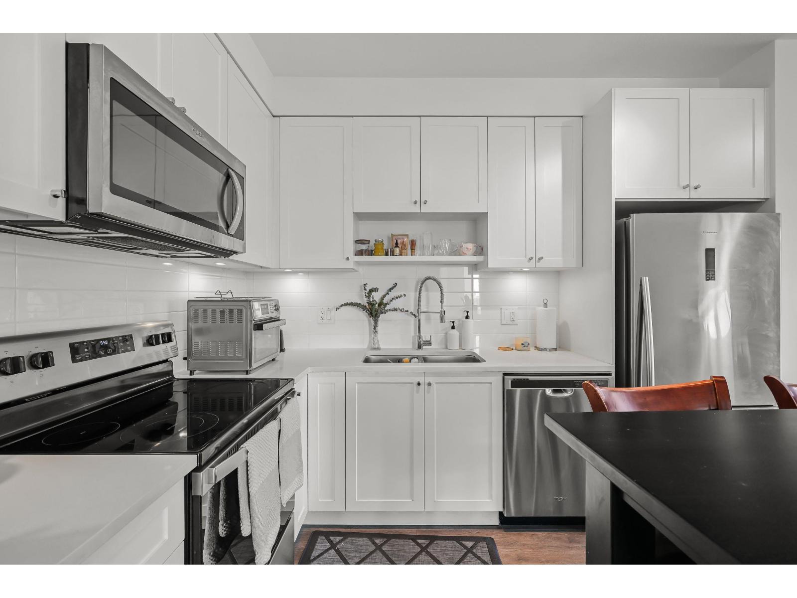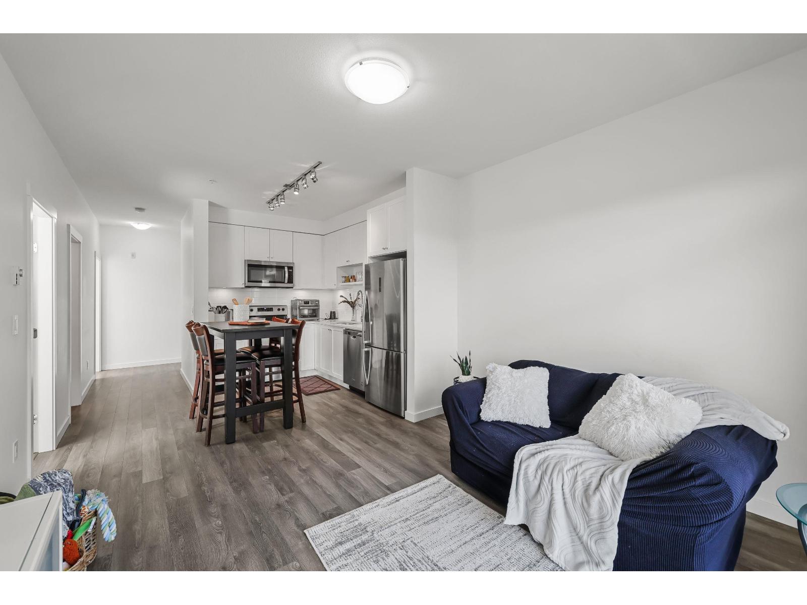 | Welcome to King's Landing by Dawson & Sawyer! This bright corner unit offers 2 bedrooms, 2 bathrooms, and a spacious open-concept layout. The generously sized primary bedroom features a double-sink ensuite, while the sleek kitchen boasts quartz countertops, stainless steel appliances, and laminate flooring throughout. Includes 1 parking and 1 storage. Located on King George Blvd, a few steps to Costco, Superstore, restaurants, and easy transit routes. Enjoy stunning mountain views and experience modern living at its finest! Call now to book your appointment! (id:5347) | |||