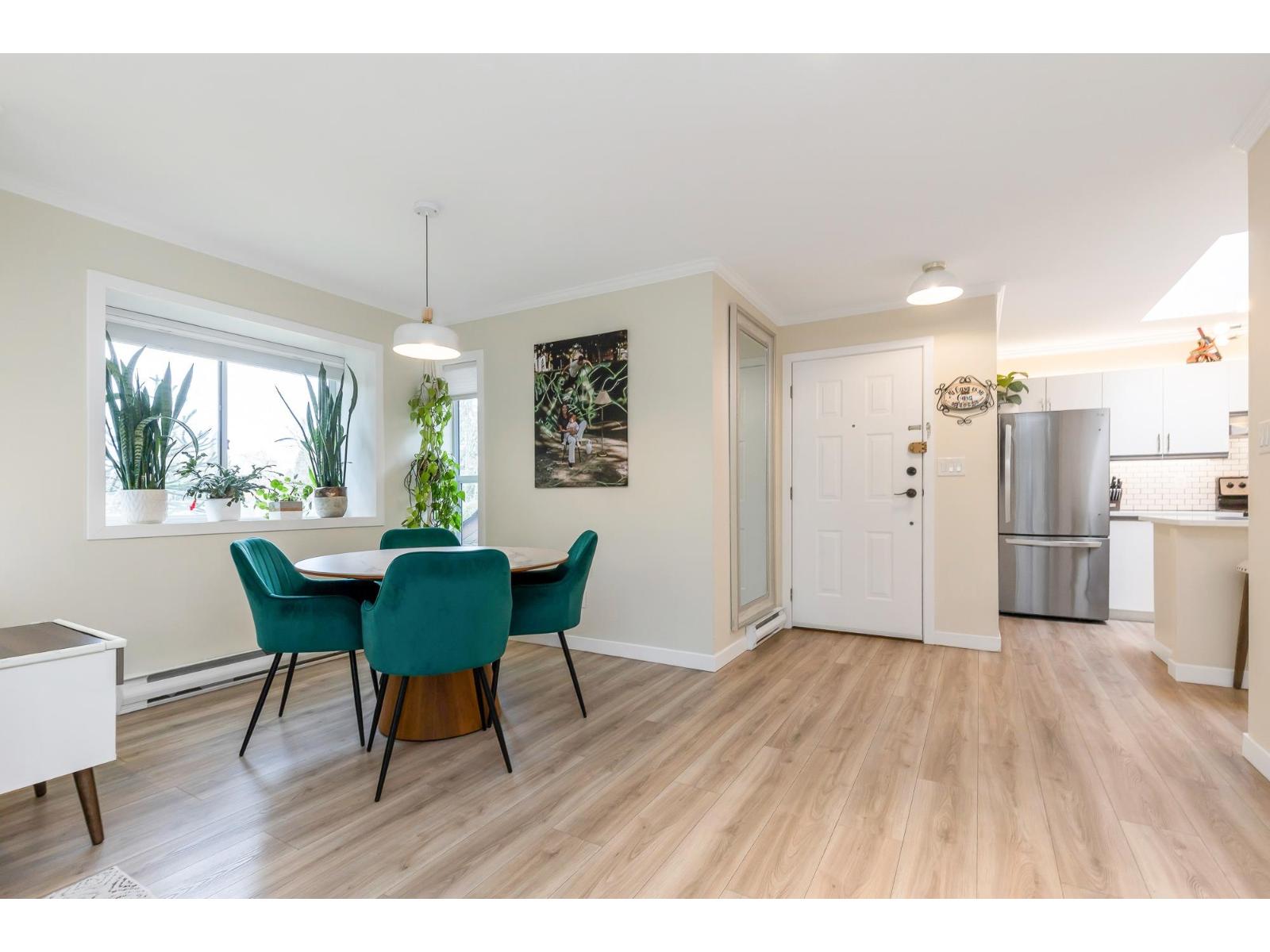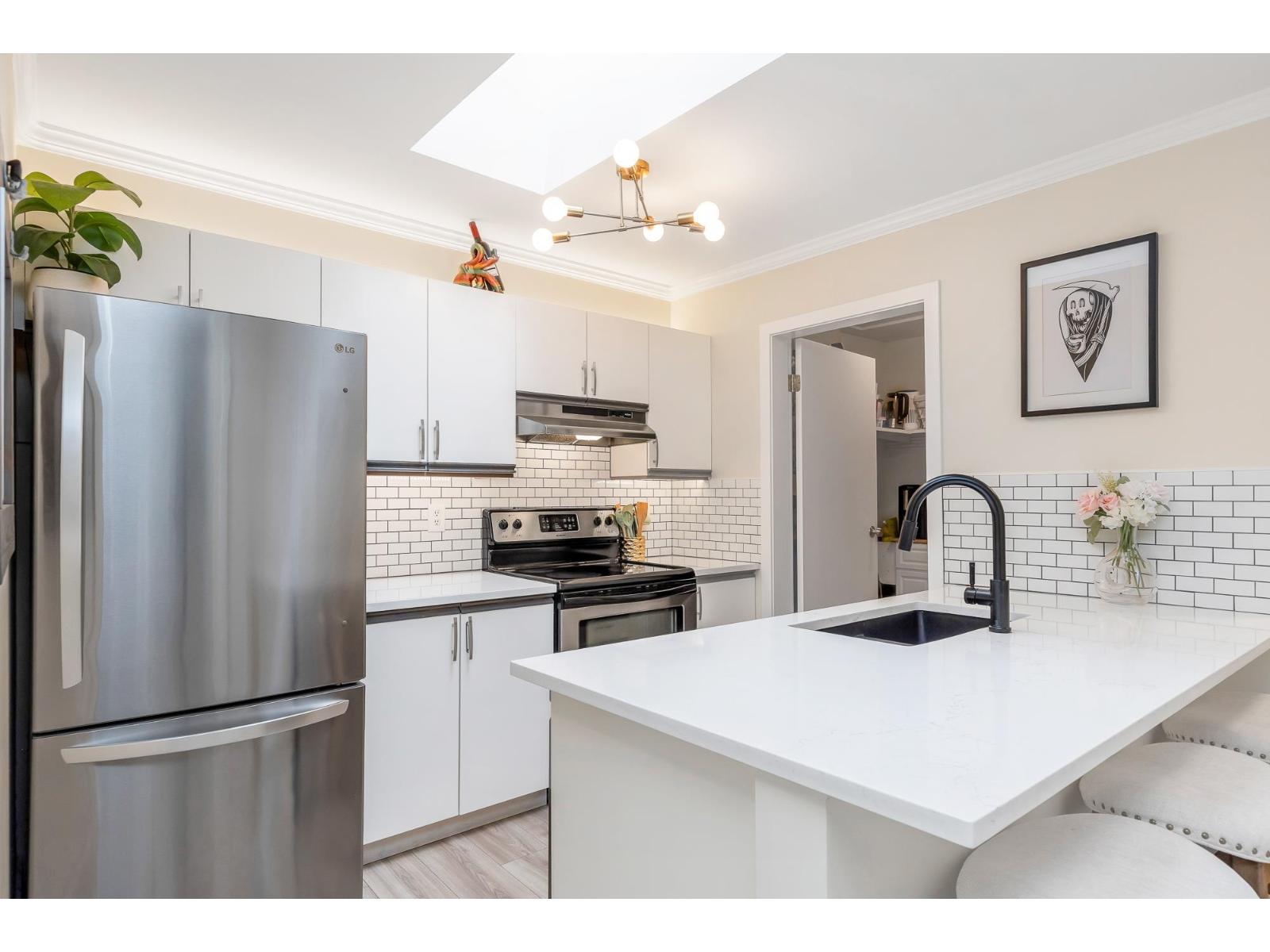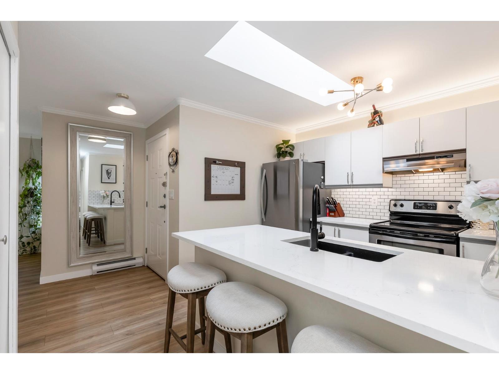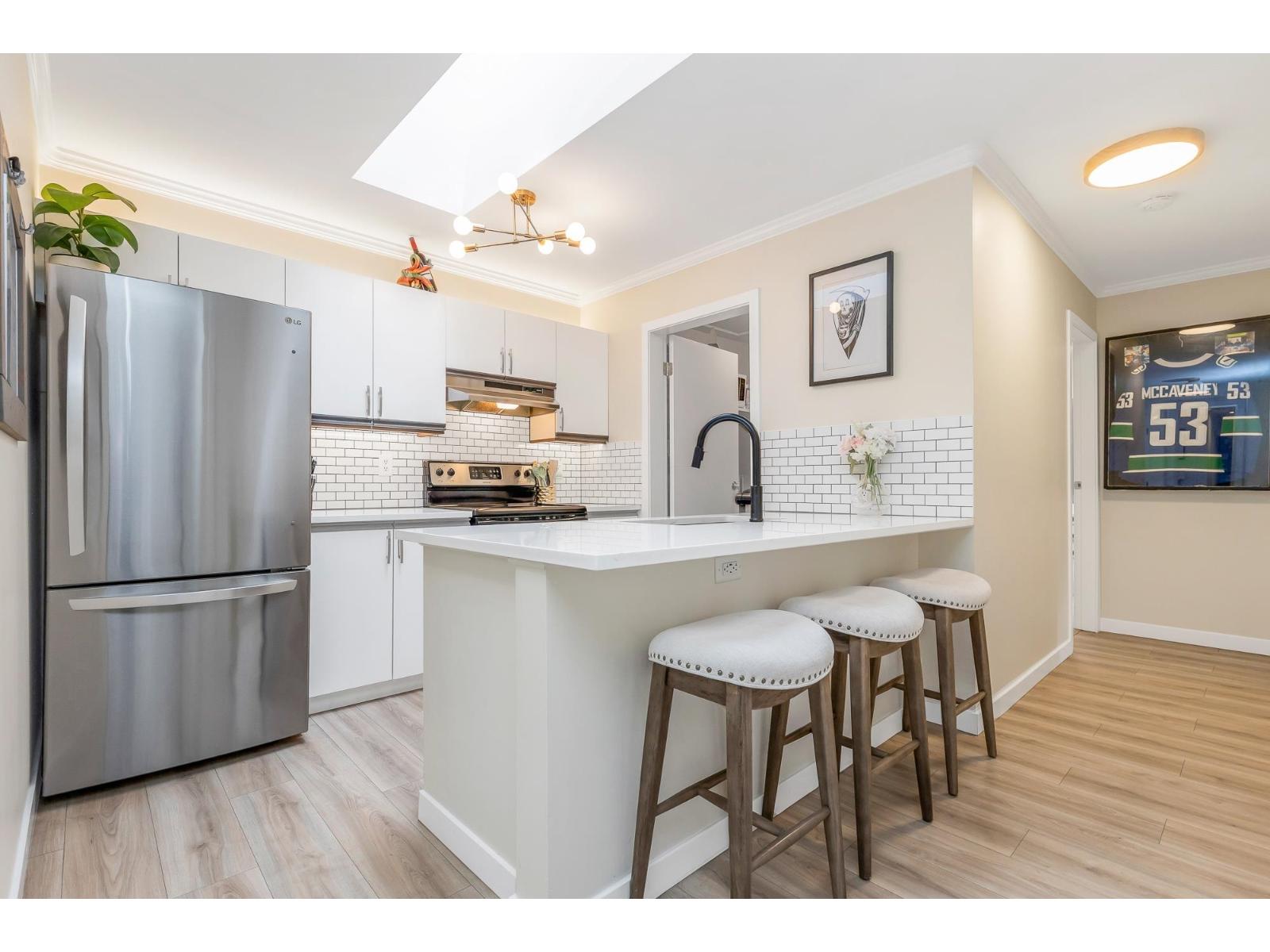 | Top corner townhome with a bright open layout. Lots of windows and 2 skylights for plenty of natural light. Stylish updates throughout including designer colours, newer flooring, quartz counter tops, stylish backsplash, crown mouldings and pot lights to mention a few. Spacious walk-through closet with cheater ensuite access. Private balcony overlooking treed area. Park is 1 block away and easy access to Hwy 1 and the pedestrian overpass to UFV. Pet friendly with no age restrictions. Nothing to do here but move in and enjoy! 2 parking spots available. 1 cat or 1 dog max 25lbs (id:5347) | |||