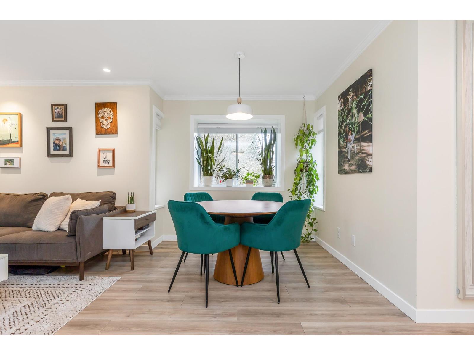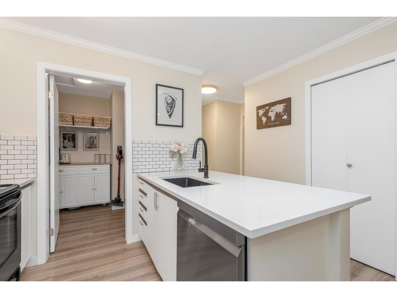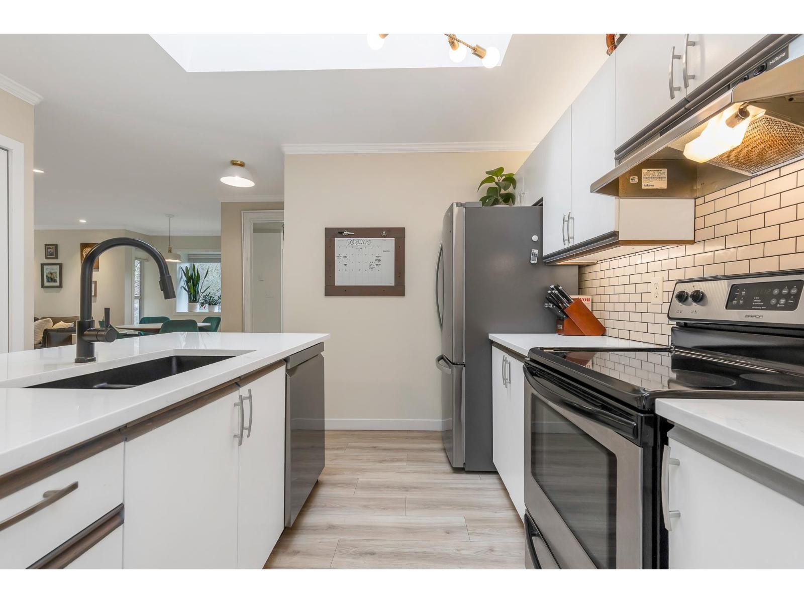 | Top corner townhome with a bright open layout. Lots of windows and 2 skylights for plenty of natural light. Stylish updates throughout including designer colours, newer flooring, quartz counter tops, stylish backsplash, crown mouldings and pot lights to mention a few. Spacious walk-through closet with cheater ensuite access. Private balcony overlooking treed area. Park is 1 block away and easy access to Hwy 1 and the pedestrian overpass to UFV. Pet friendly with no age restrictions. Nothing to do here but move in and enjoy! 2 parking spots available. 1 cat or 1 dog max 25lbs (id:5347) | |||