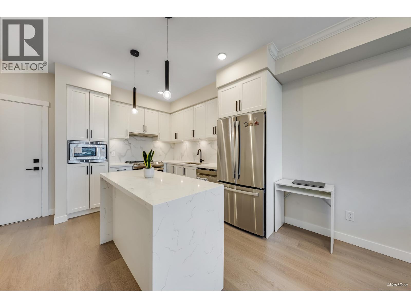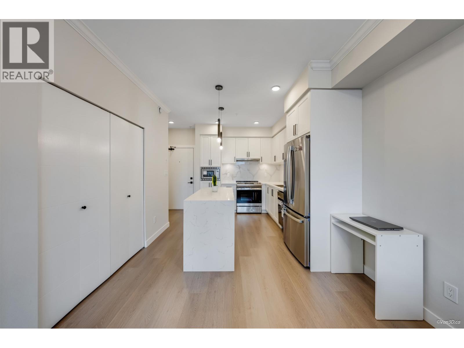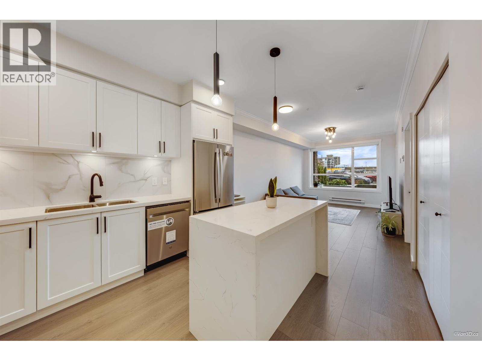 | Enjoy new construction without the GST! This bright 1-bedroom, 1-bathroom home offers a modern open-concept layout featuring white quartz countertops, Italian tile backsplash, stainless steel appliances, durable laminate flooring, and soft carpet in the bedroom. Roughed-in for A/C for added comfort. Residents enjoy premium amenities including a fully equipped gym, yoga studio, social lounge, rooftop outdoor spaces, play area, and game room. Includes 1 parking stall and 1 bike/storage locker conveniently located nearby. Centrally located near shopping, transit, schools, parks, medical services, and Downtown. The ground-floor patio with a private street gate provides extra outdoor space and easy access for dog walking. (id:5347) | |||