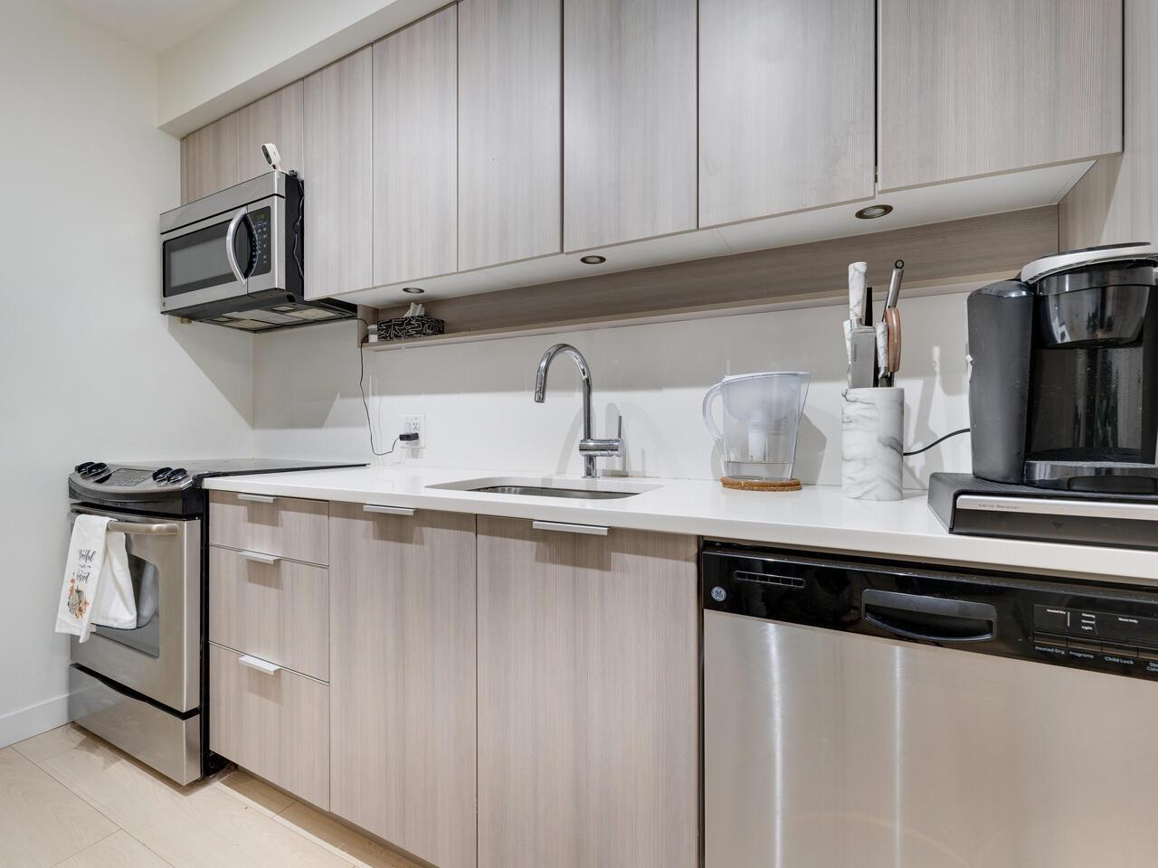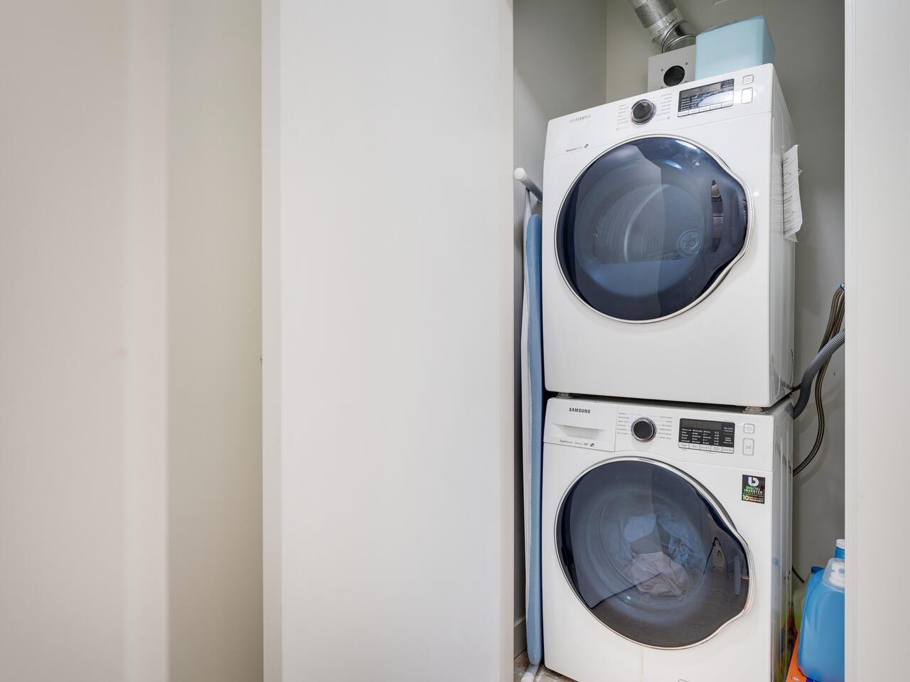 Welcome to Evolve, the heart of Surrey! This stunning 1-bedroom, 1-bathroom condo offers modern living with breathtaking city and mountain views. The unit boasts an open-concept design with floor-to-ceiling windows, filling the space with natural light and creating a bright, airy ambiance. The contemporary kitchen features sleek stainless-steel appliances, quartz countertops, and ample storage, perfect for cooking and entertaining. Enjoy the convenience of in-suite laundry, a spacious balcony, and access to a range of building amenities, including a fitness center, rooftop terrace, and social lounge. Located in Surrey's vibrant downtown core. Perfect for investor and starter! (id:5347)