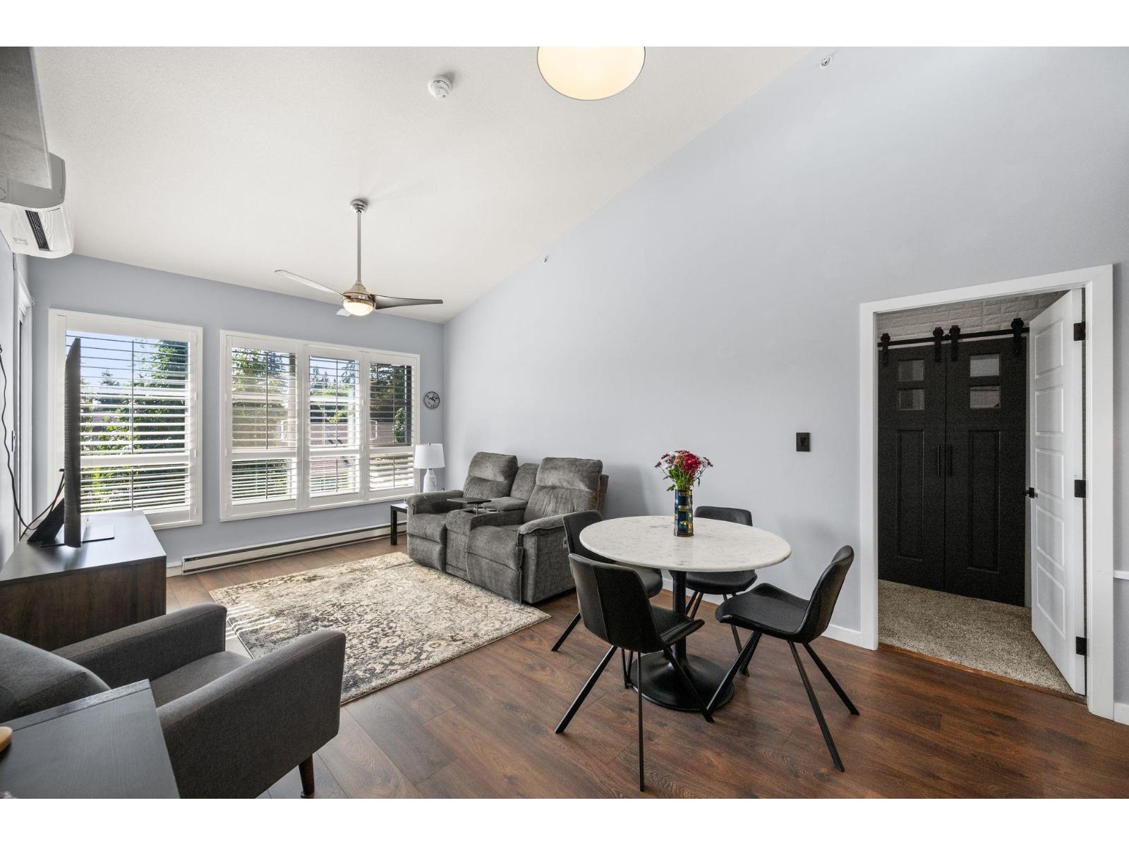 | TOP FLOOR, VAULTED CEILINGS! Beautifully bright and sunny south exposure! Downsizer alert! This is the unit that you've been waiting for! Downsize in safety and comfort in this 2BDRM 2 BATH condo, with one occupant needing to be 55+ in age. Up to 13'ft vaulted ceilings! White kitchen cabinetry, S/S appliance package incl gas stove, granite counters. Heated ensuite tile floor in the master bath. 2nd Bdrm with cheater ensuite/main bath. Updated laminate floors and newer carpet in bdrm's. California shutters. Updated paint and lighting throughout. BONUS storage locker on the same floor and 2 side by side parking stalls. Secure bike storage, fitness room and clubhouse included!NEW Heatpump offering A/C! (id:5347) | |||