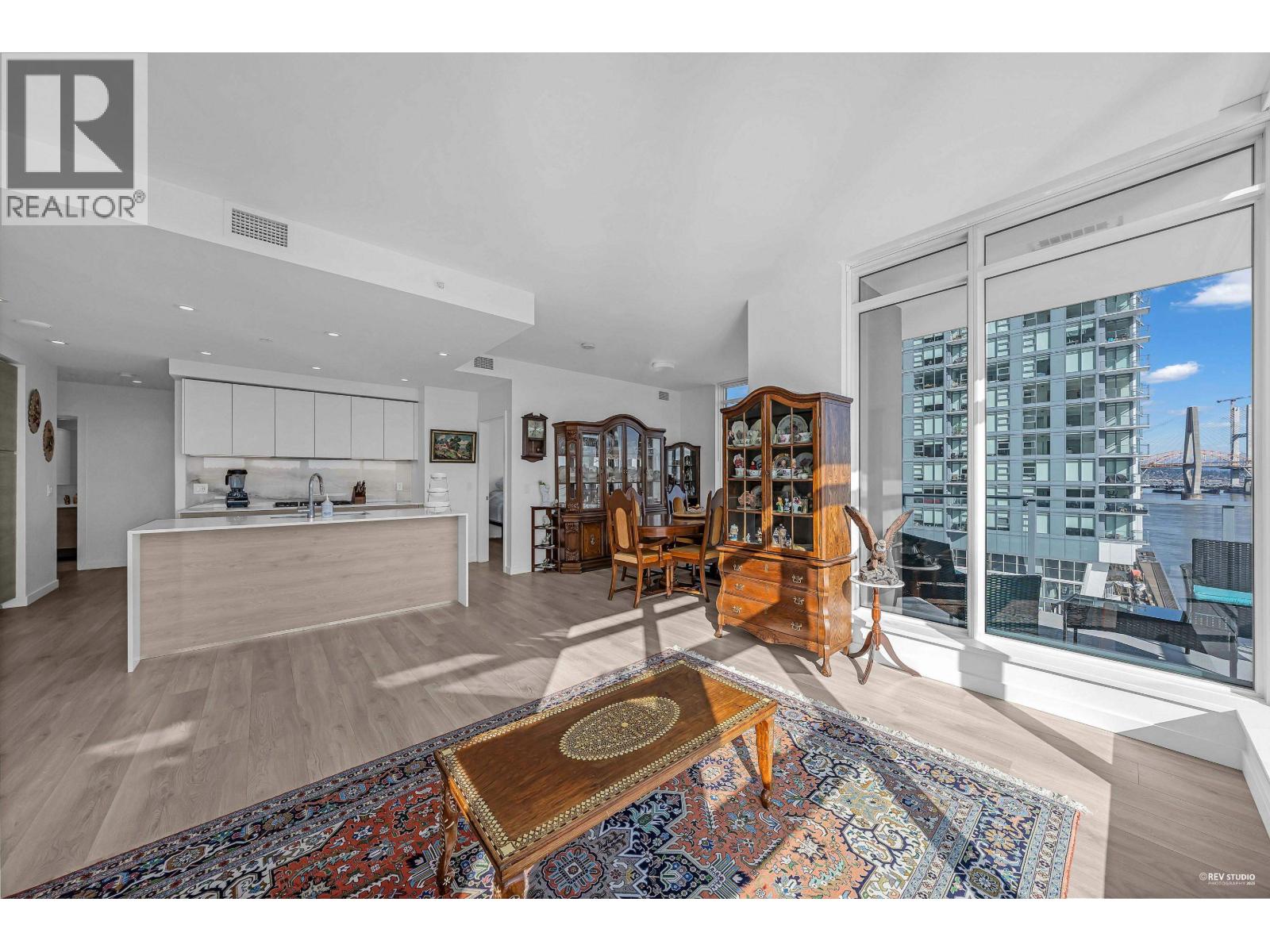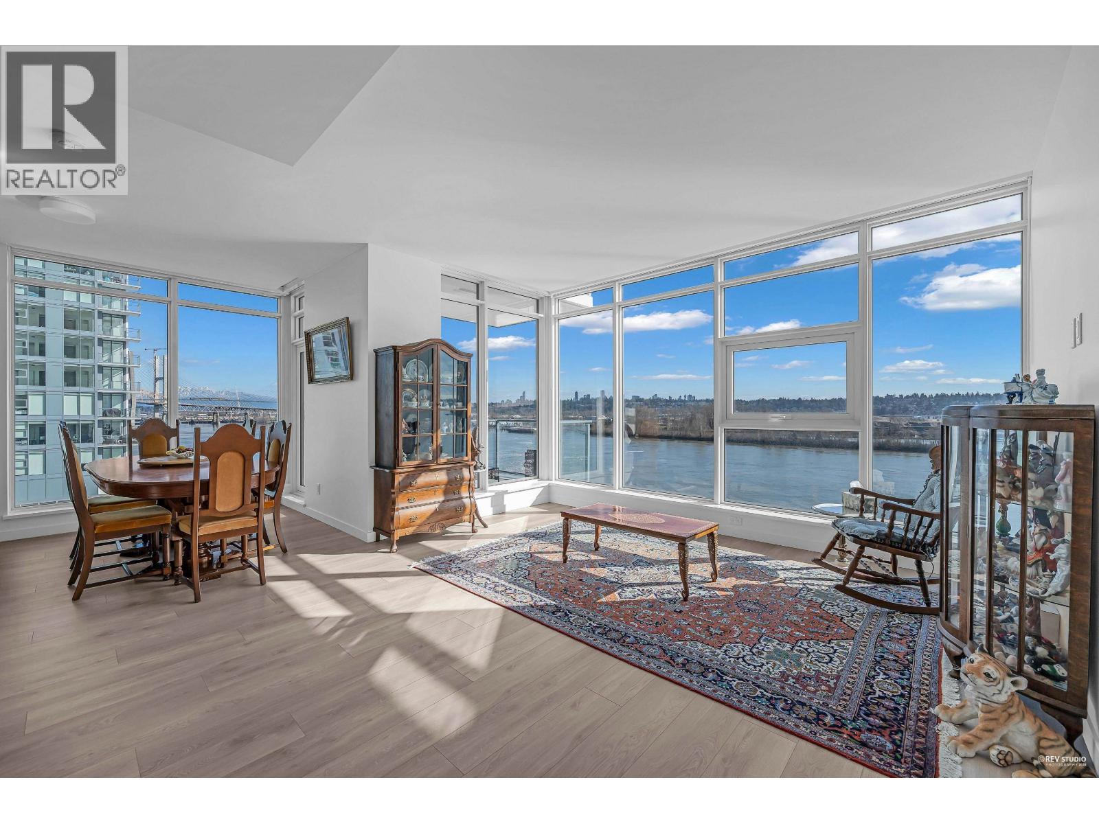 | Set in the heart of New Westminster´s lively waterfront community, this exceptional corner residence captures panoramic mountain scenery, sparkling city views, and uninterrupted vistas of the Fraser River. The bright two-bedroom plus den/flex layout is wrapped in floor-to-ceiling windows, filling the home with natural light. An expansive open-concept living and dining space creates the perfect setting for hosting, while the gourmet kitchen is outfitted with premium Bosch appliances, contemporary cabinetry, generous storage, and a spacious island with seating. Experience Pier West living just moments from shops, restaurants, picturesque riverfront paths, and the SkyTrain, complemented by resort-inspired amenities such as 24-hour concierge service, a fully equipped fitness centre and sauna. (id:5347) | |||