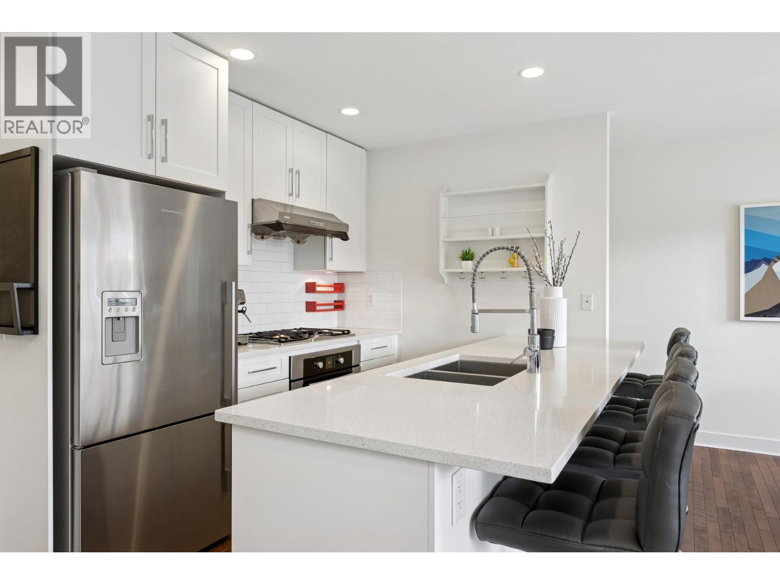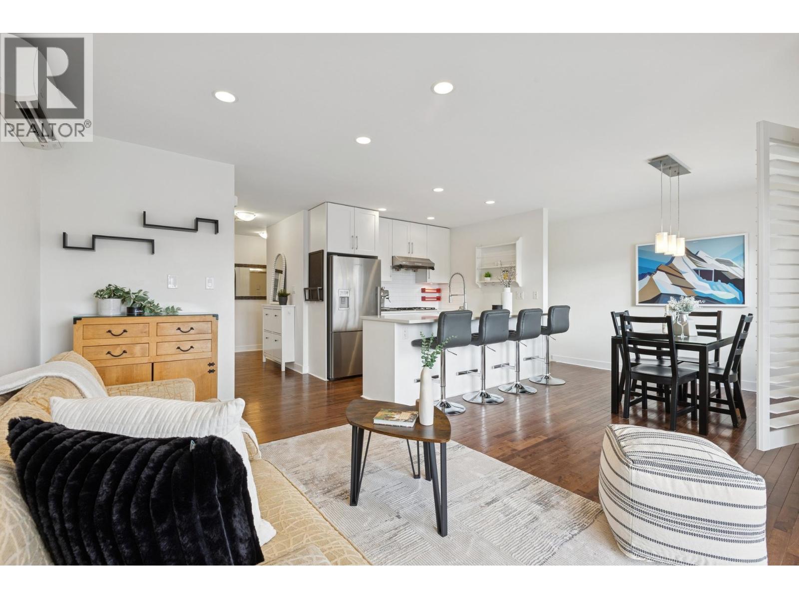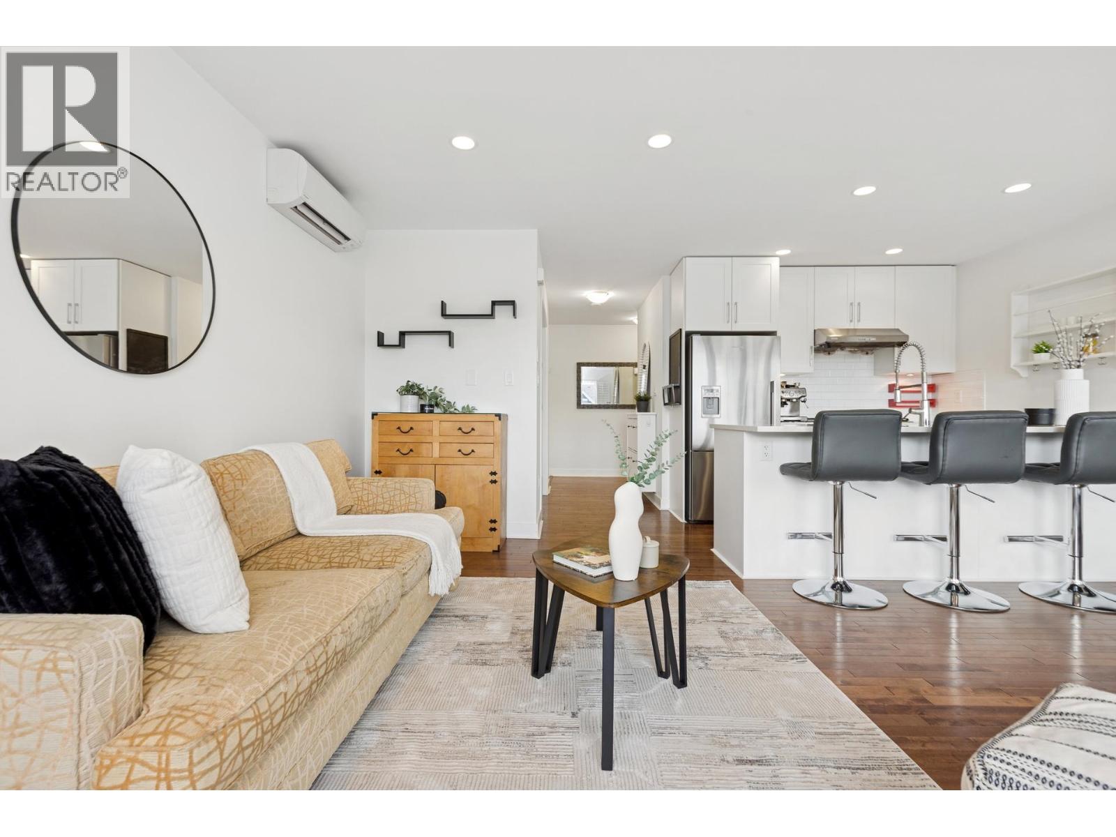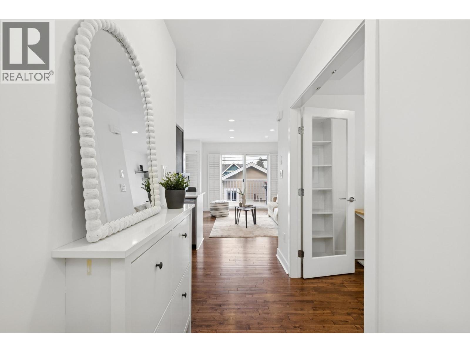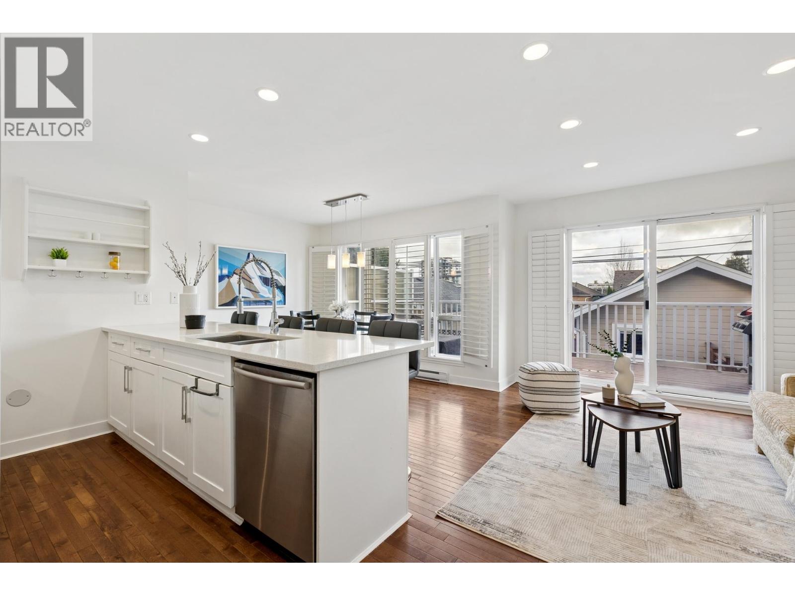| South-facing fourplex offering nearly 2,000 sq/ft of turn-key living in Central Lonsdale. This 3-bed + den home offers a detached-scale layout across 3 levels. The main floor features a designer kitchen with shaker cabinetry, quartz counters, gas cooktop, and bar seating. Open living and dining areas lead to an expansive south-facing deck and private fenced yard with low-maintenance artificial turf. Unique to this floor plan is a main-floor office with French doors and a full bathroom. Upstairs features a spacious primary suite with a walk-in closet and private SW balcony, plus a 2nd bedroom and spa-style bath with double vanity. The lower level offers a separate entrance, bedroom, and bath - perfect as a nanny suite or future rental (kitchenette ready). Recent upgrades include a high-efficiency heat pump (A/C on all floors), fresh paint, and new carpets. 2 parking (1 garage). Just off the Green Necklace trail, steps to Lonsdale shops and the new Harry Jerome Rec Centre. Quick Hwy 1 access. (id:5347) | |||