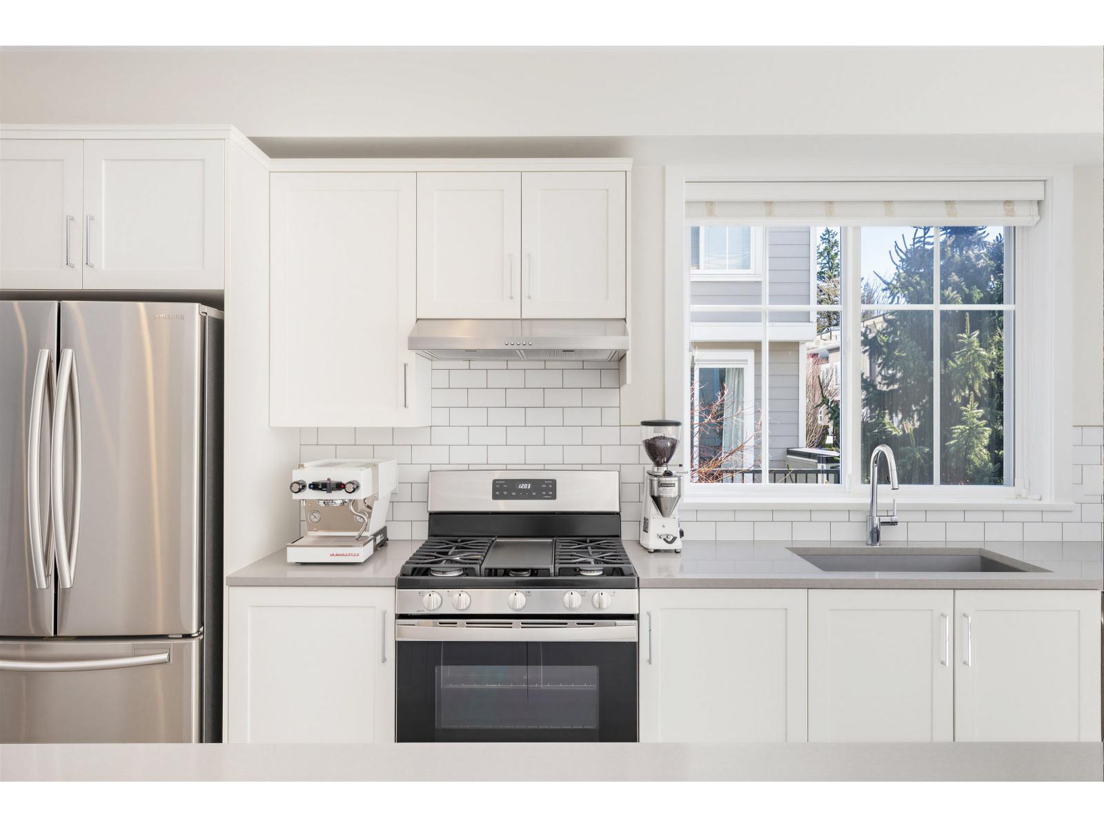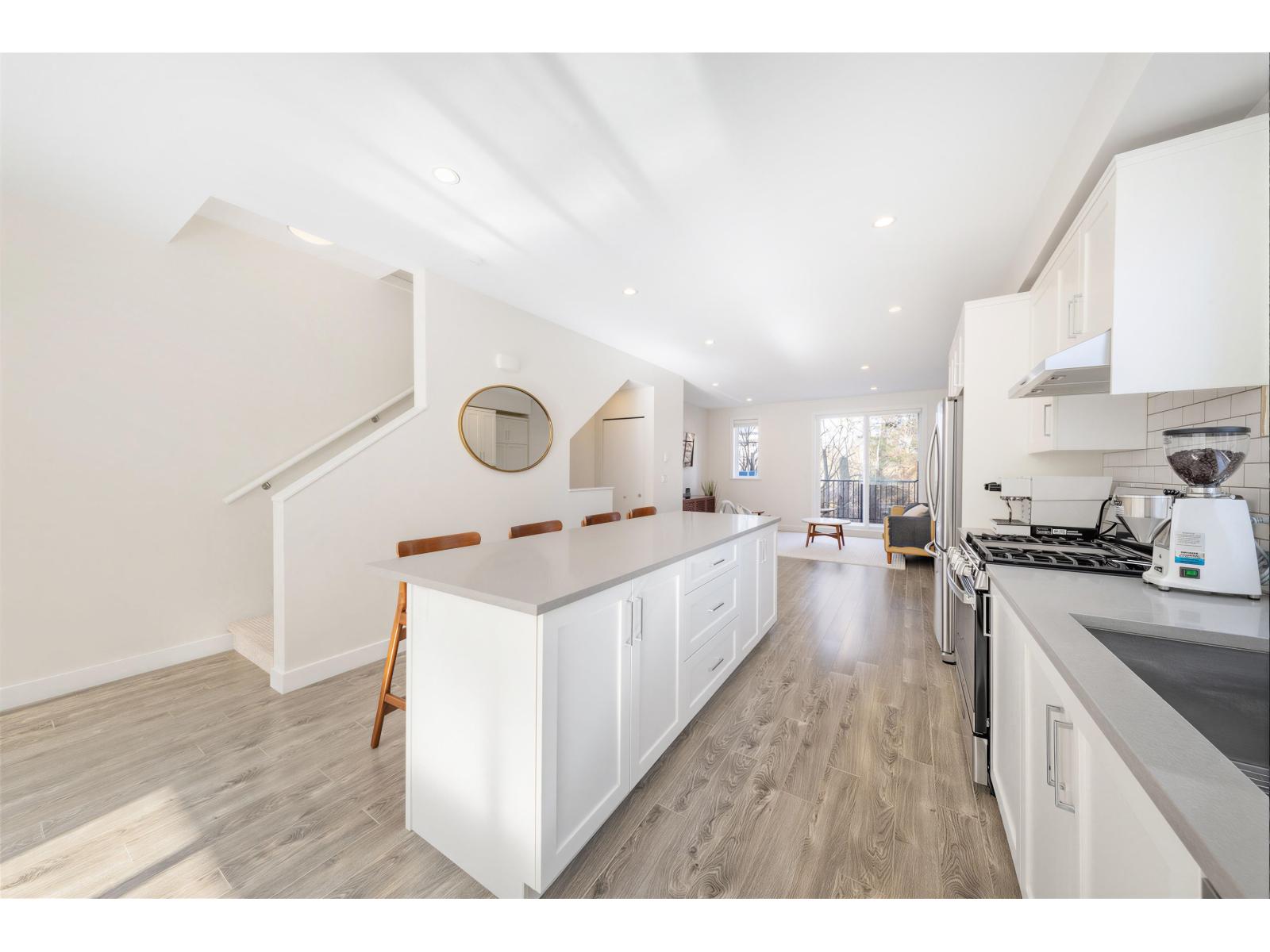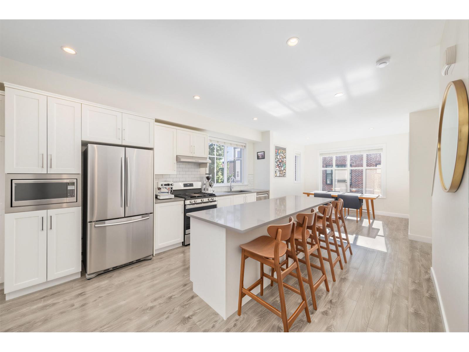 | BEST LOCATION end-unit townhome in the Complex offering 3 bedrooms, 3 bathrooms plus a den, with bright, move-in ready living space. Enjoy two outdoor areas - a private main-floor balcony and a 388 sq.ft. rooftop deck featuring a custom wraparound bench and privacy wall, perfect for entertaining while overlooking peaceful greenbelt views. The open-concept kitchen showcases a large quartz island, ample cabinetry, a 2026 gas range, along with a convenient powder room on the main level. As a desirable end unit, extra windows throughout provide abundant natural light. Rare live/work zoning allows for a legal home-based business or private office with separate garden entry. Ideally located between Grandview and Morgan Creek Golf Course, with easy access to shopping, schools, transit, and Hwy 99. OH: March 07 from 2-4pm. (id:5347) | |||