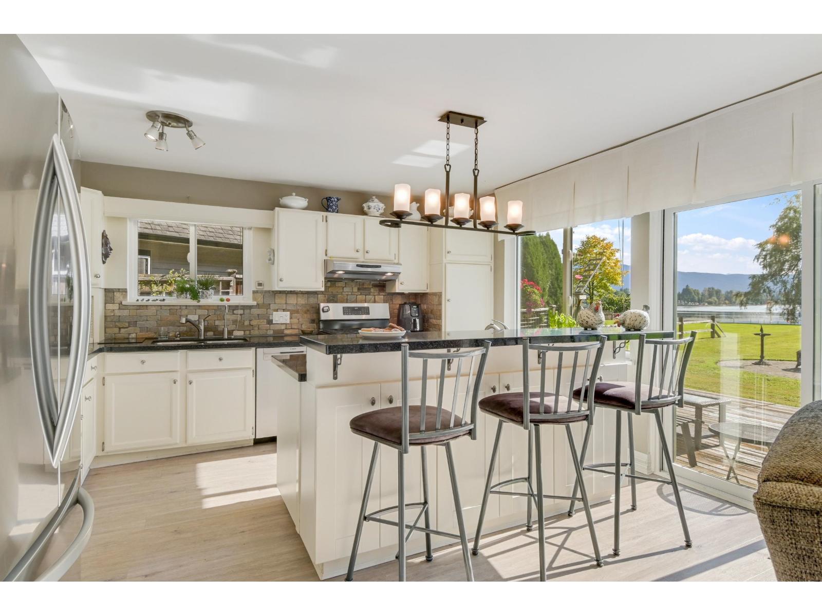 | Rarely available! Lower mainland's Hatzic Lake gem, in Sheltered Cove, for summer family gatherings, fishing, swimming, and boating vacations or year round living. Rancher over 1400 sq feet, on amazing unique property. 3 bedrooms, 2 full bathrooms and a large double garage with workshop area. No problem with the family pulling up with their RV's for a stay! Option to purchase share of ownership to gated resident park with boat launch just down the road. Enjoy the expansive green lawn to a dock for your lake enjoyment. Gourmet kitchen with dual fuel double oven, gas cooktop. Stainless appliances, quartz countertops, island with 2nd sink, built in cabinets in living room. Remote controlled deck awning. 2 large sheds. Must see! (id:5347) | |||