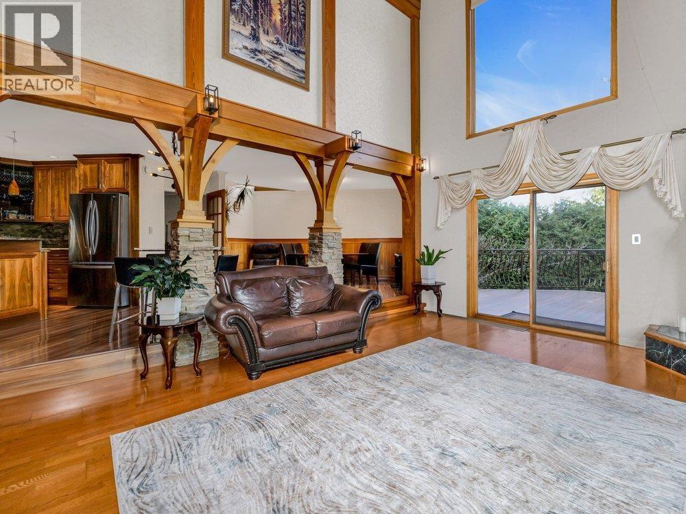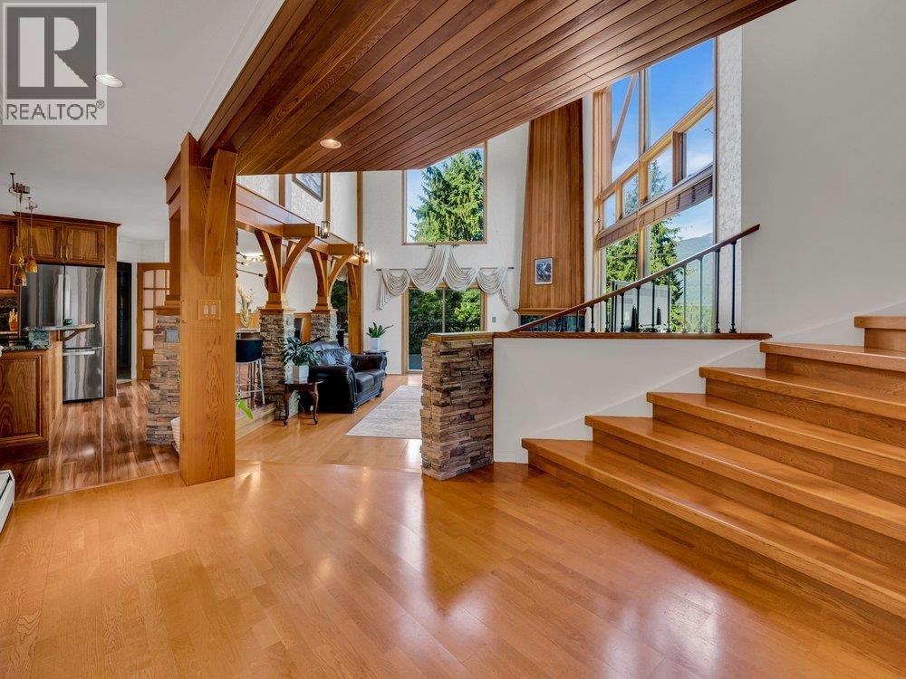 | Private! Unique! With the mountains and ocean views!! Very well kept! On the quiet "no through" road, gates open to estate sized leveled gardens & architectural designed home, backs onto parkland. House was substantially renovated for the last 7 years with the metal room, hardie board siding, new railing around the decks and patios, new walnut kitchen, all bathrooms were renovated and much more. 20 ft vaulted ceilings, skylights, big wood windows, & open floor plan make bright & cheery home. Curved staircase leads to large landing & huge master bedroom, connecting dressing room with separate vanity & sink. 3 pce ensuite bath too! Downstairs is a large rec room, sauna & workshop (den/bdr/office) has separate entrance and has a potential to make a suite. (id:5347) | |||