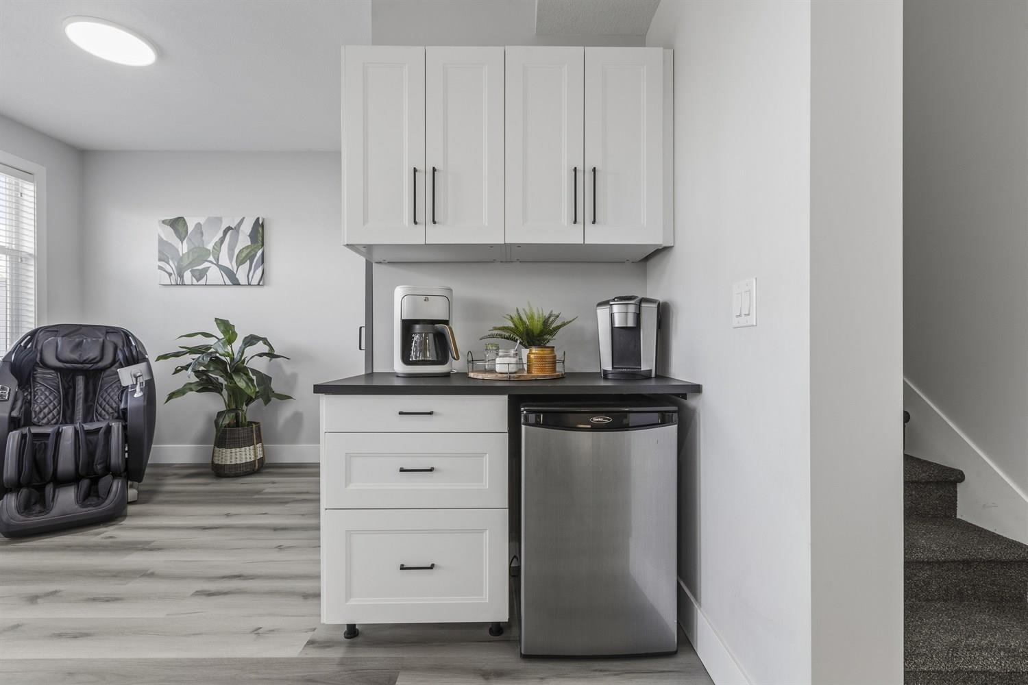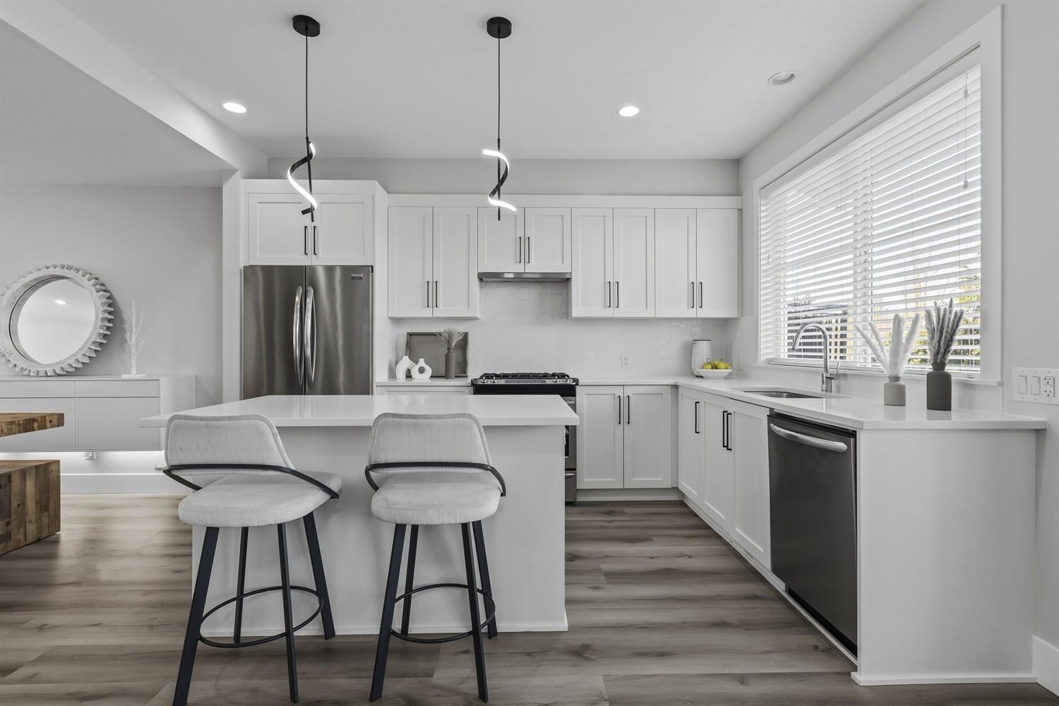 | Welcome to Olivia, this 4-bed, 4-bath townhome offers over 2,000 sq.ft. of open-concept living with 9' ceilings and modern finishes throughout. Main floor features spacious living and dining areas, powder room, and gourmet kitchen with quartz countertops, gas range, and s/s appliances, opening to a large balcony with BBQ hookup and views. Upstairs includes a vaulted primary bedroom with mountain views, WIC and ensuite, two additional bedrooms, full bath, and laundry room with upgraded side-by-side w/d. Versatile fourth bedroom and flex space below with backyard access. Includes A/C, double garage with driveway parking, and upgrades throughout, including new flooring & EV hookup. Steps to parks, schools, Morgan Crossing, and Hwy 99. A perfect blend of style, comfort, and convenience. (id:5347) | |||
