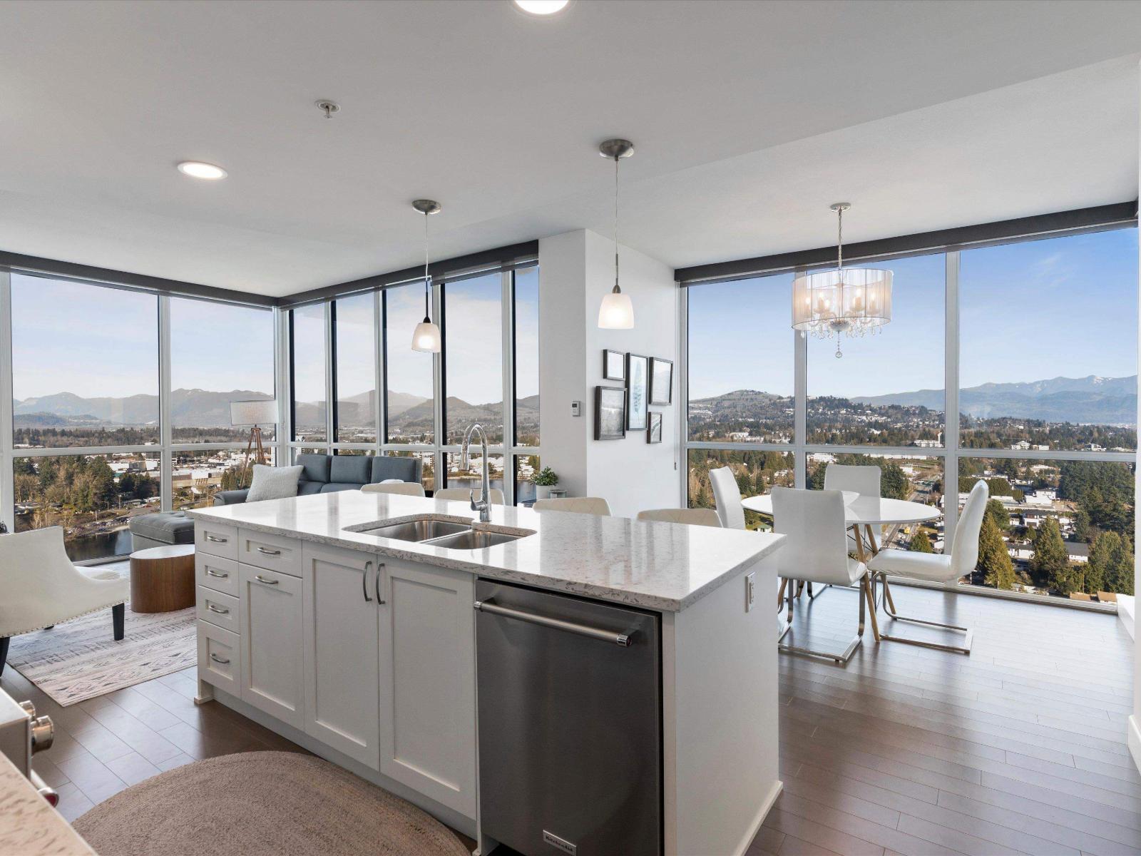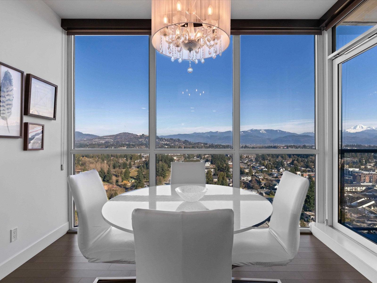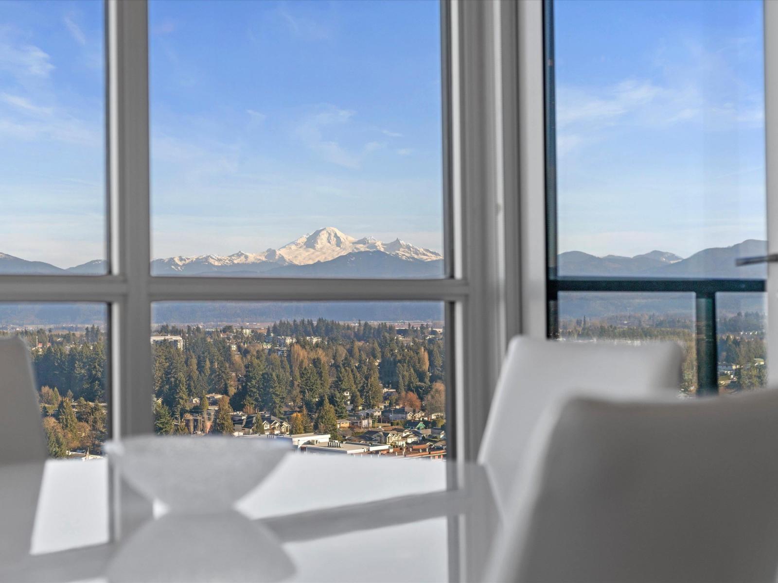 | Perched high on the 23rd floor of The Mahogany, this exceptional 2 bedroom, 2 full bathroom residence offers breathtaking panoramic views rarely found anywhere in the Fraser Valley. From the white snow-capped peak of Mount Baker to the shimmering reflections off Mill Lake and the valley stretching beyond, the scenery is truly remarkable. Step onto your private balcony to take in the ever-changing landscape that is perfect for morning coffee or evening sunsets. Inside features stainless steel appliances and efficient geo heating and cooling for year-round comfort. Enjoy resort-style amenities including an indoor pool, hot tub, fitness centre, resident lounge, 2 guest suites, and secure parking, all steps from Mill Lake Park, the hospital, shopping, restaurants, and quick highway access. (id:5347) | |||