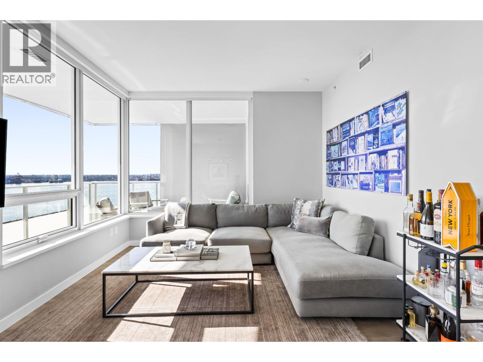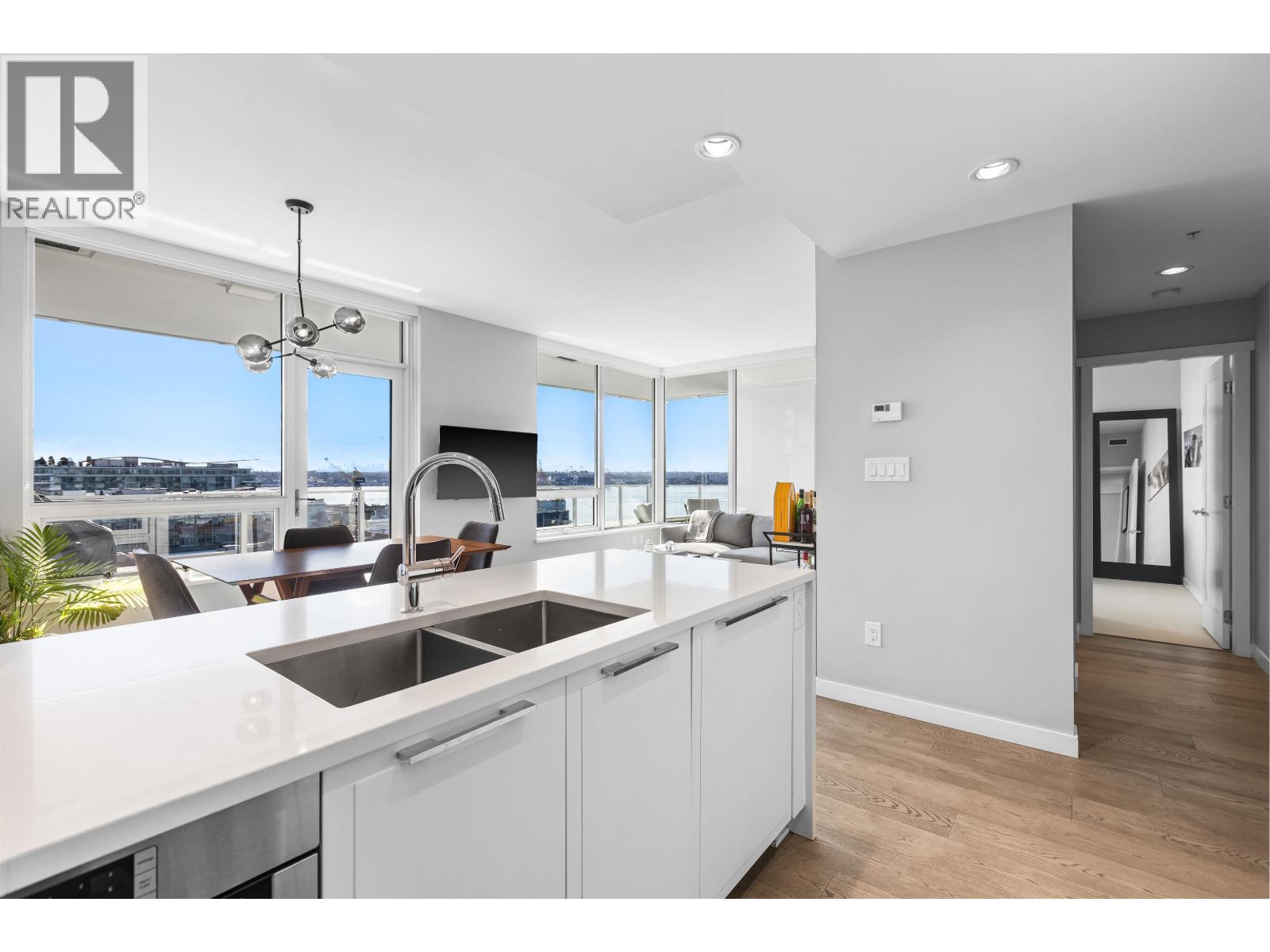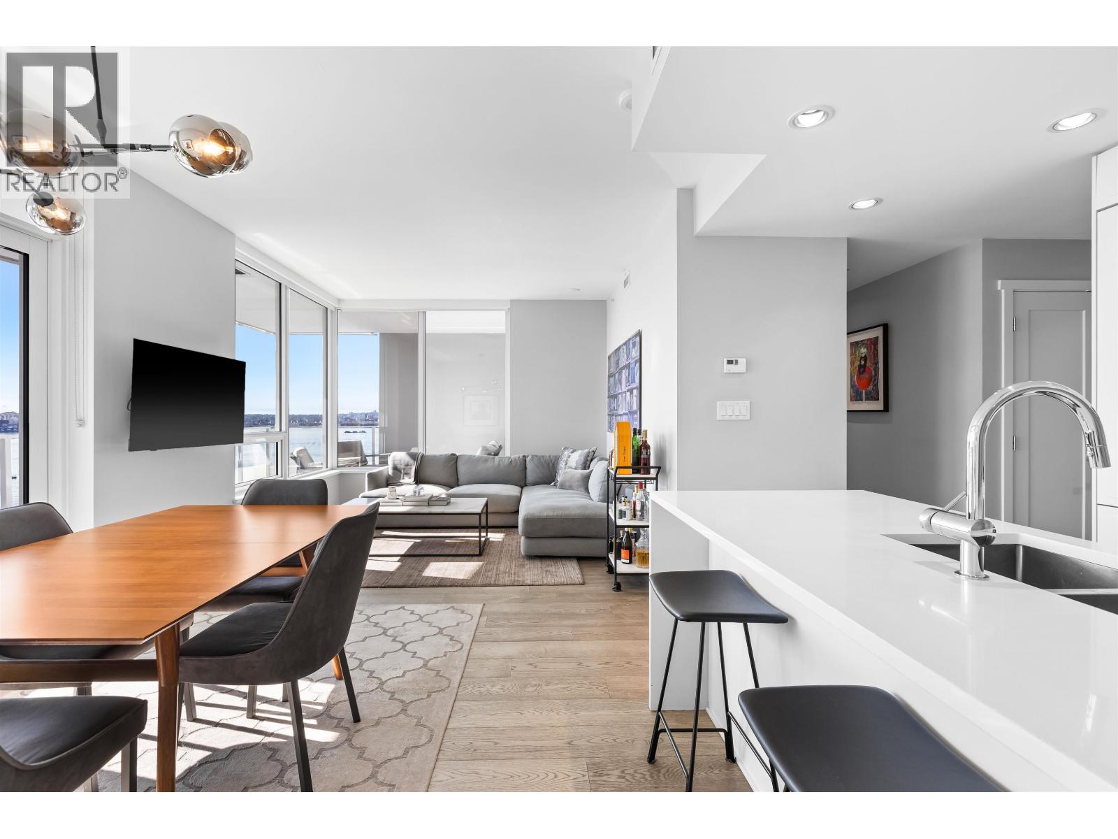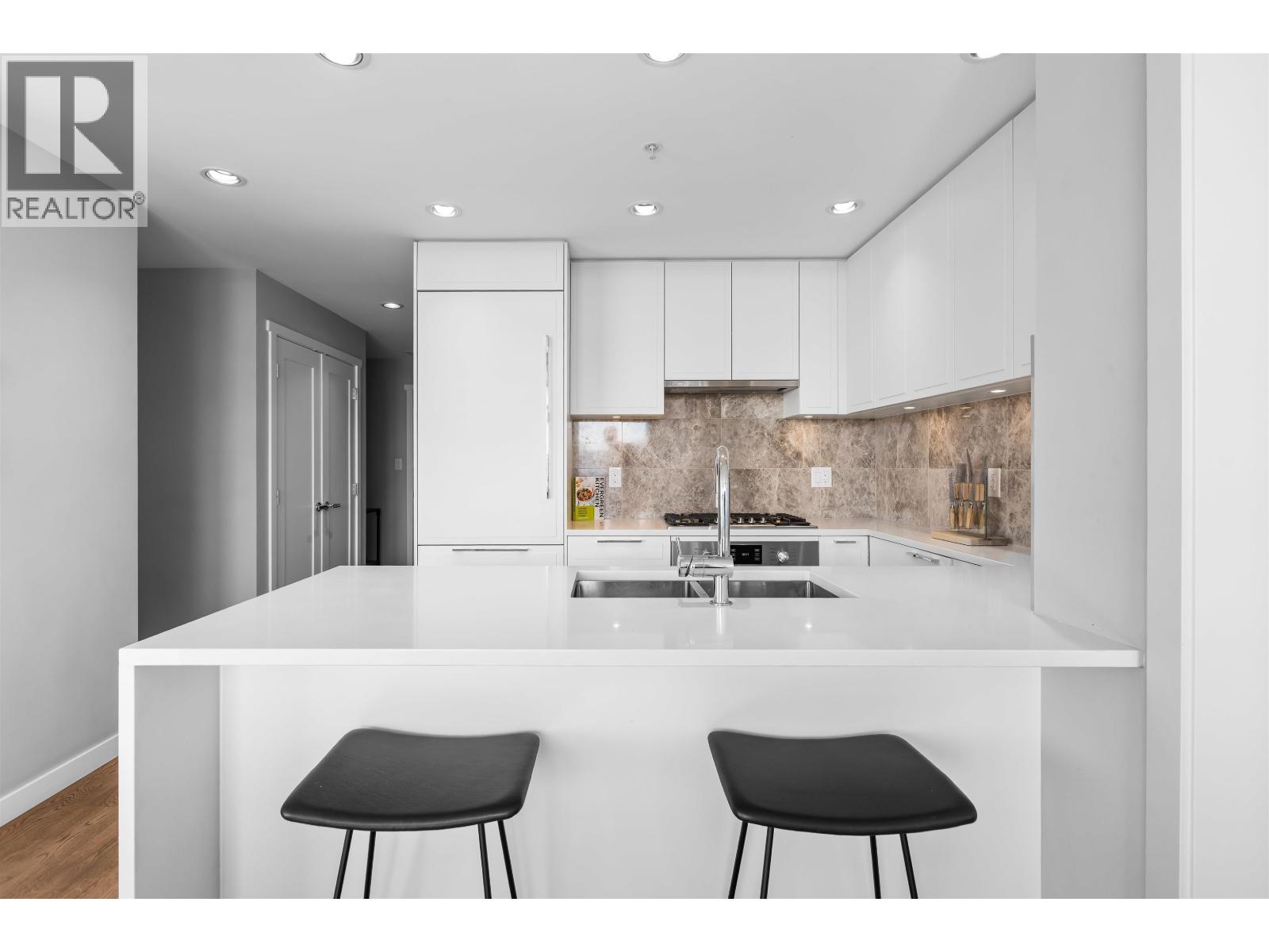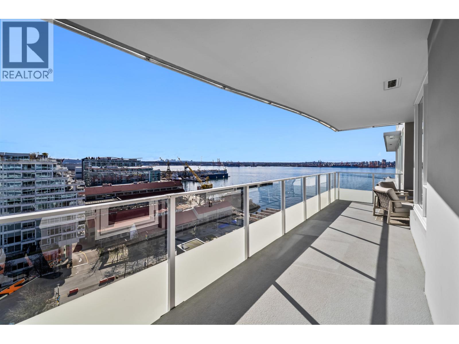 | Welcome to Promenade by Polygon in the heart of Lower Lonsdale. This rare waterfront-facing two-bedroom, two-bathroom home is one of the best positioned units in the building, offering incredible views and natural light. Features include engineered hardwood floors and a gourmet kitchen with integrated appliances, five-burner gas range, marble backsplash, and large eating bar. The spa-inspired ensuite includes marble finishes, rain shower, and built-in bench. Enjoy the almost 300 square ft covered balcony while taking in the views. Includes one parking and one storage. Amenities include concierge, air conditioning, gym, lounge, dog wash, and visitor parking. Just steps to the SeaBus, restaurants, and shops. (id:5347) | |||