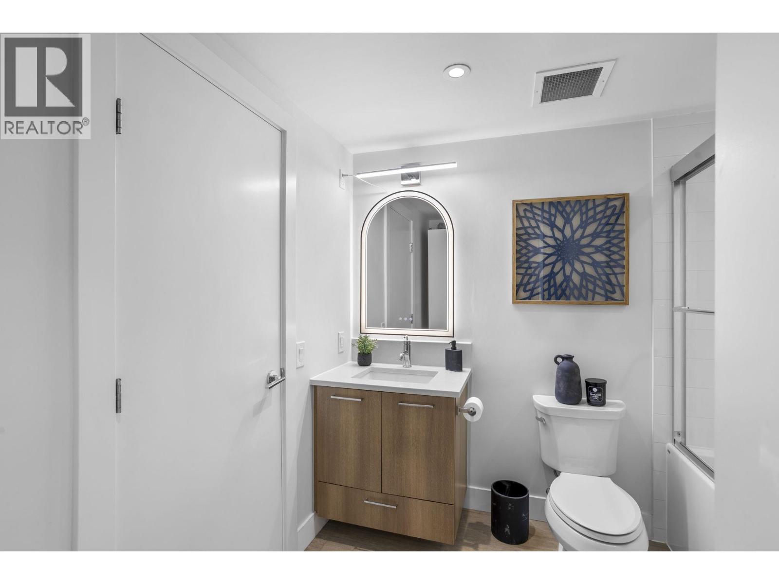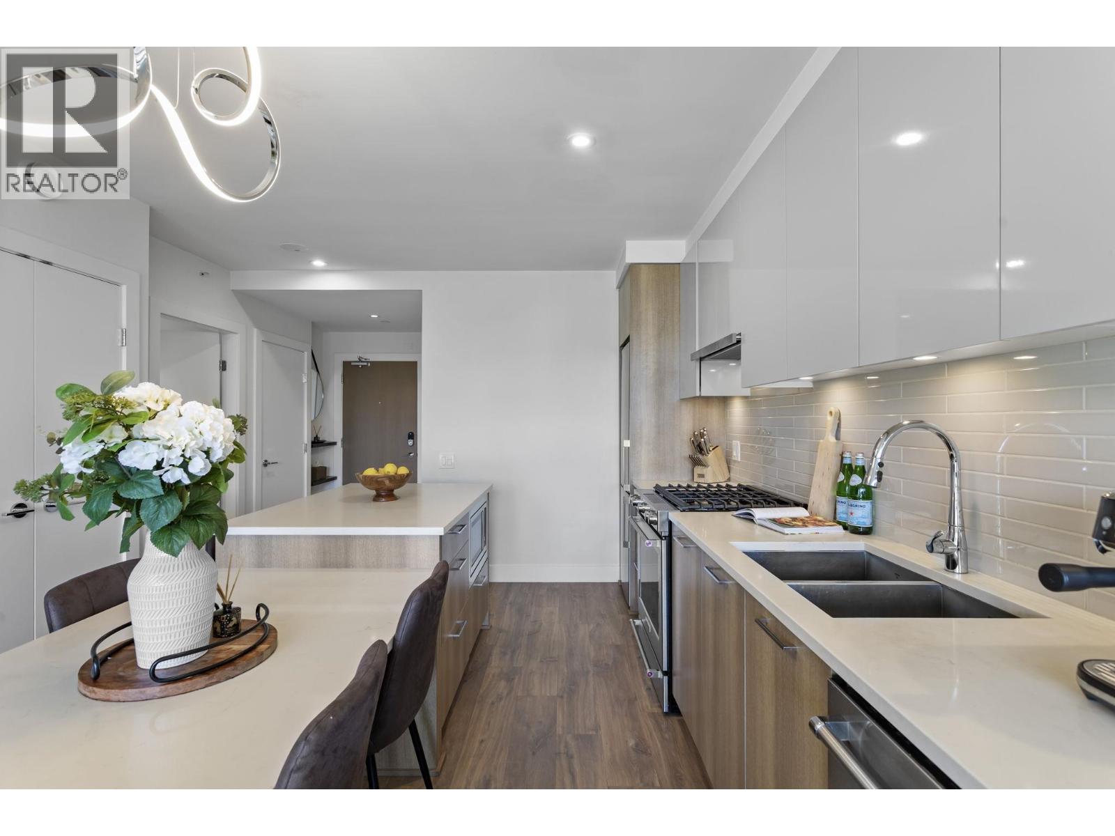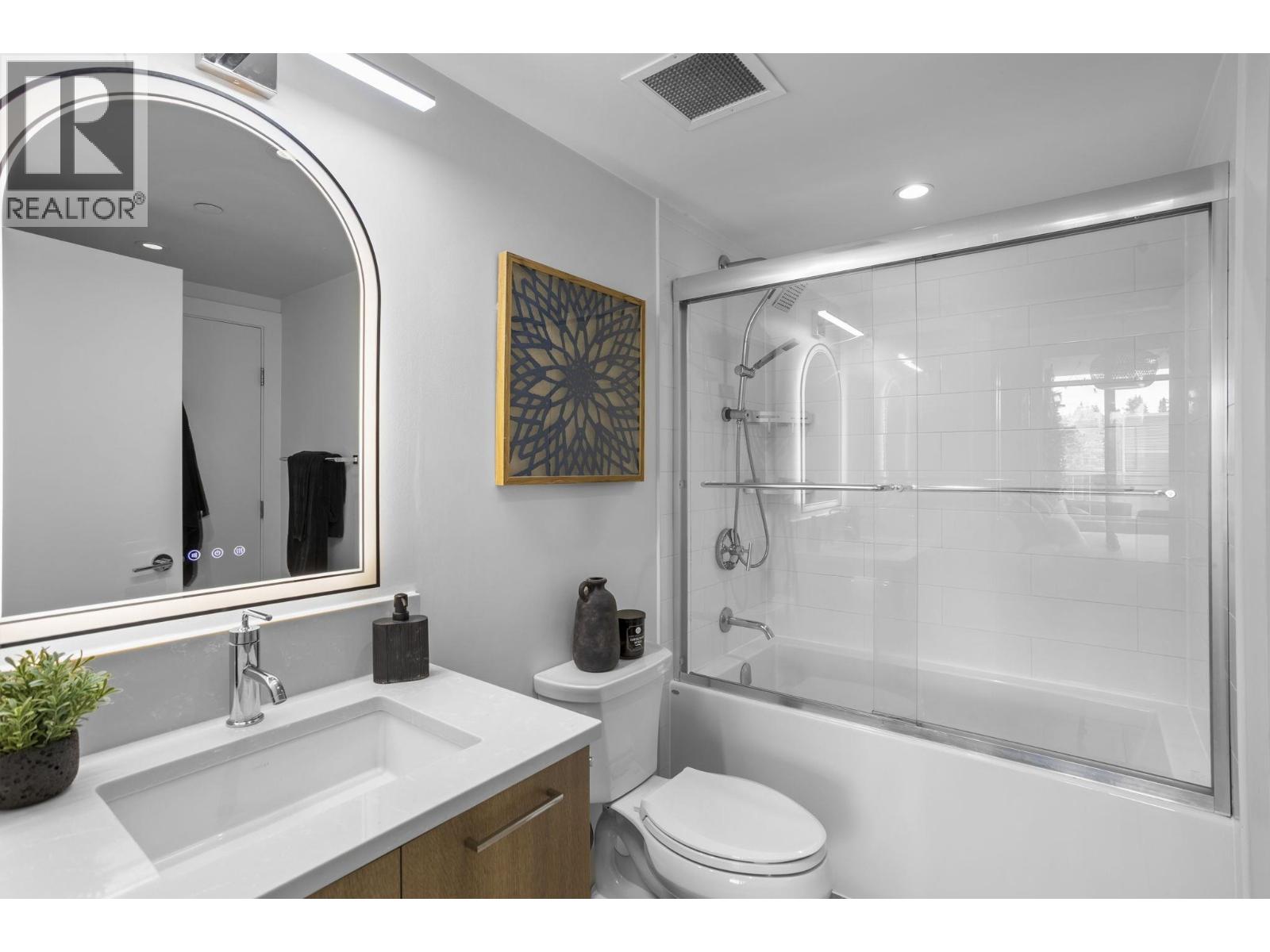 Welcome to this bright and super functional 1 bed + den home at The Columbia by Wesgroup in the vibrant Sapperton neighbourhood of New Westminster. This move-in ready home features an open layout with a spacious living area leading to a 100+ square ft covered patio on the quiet side of the building with city views. Modern kitchen with quartz counters, stainless steel appliances, and integrated dining table with entertainer´s island. Den with upgraded storage and sleek glass shower door in the bathroom. Located in the heart of the Brewery District, steps to SkyTrain, groceries, restaurants, and cafés. Includes 1 parking & large storage locker. Amazing amenities: full gym, stunning clubhouse, squash court, steam room, sauna, and dog run. (id:5347)