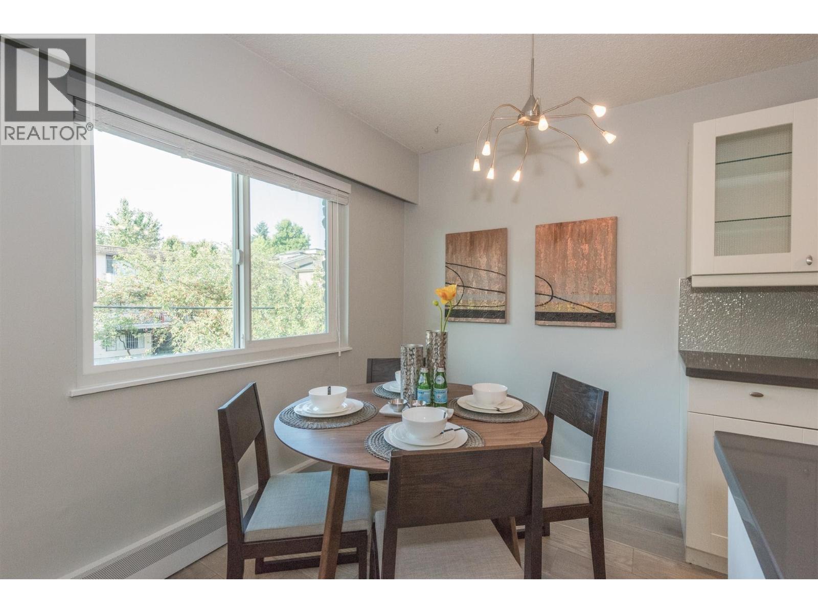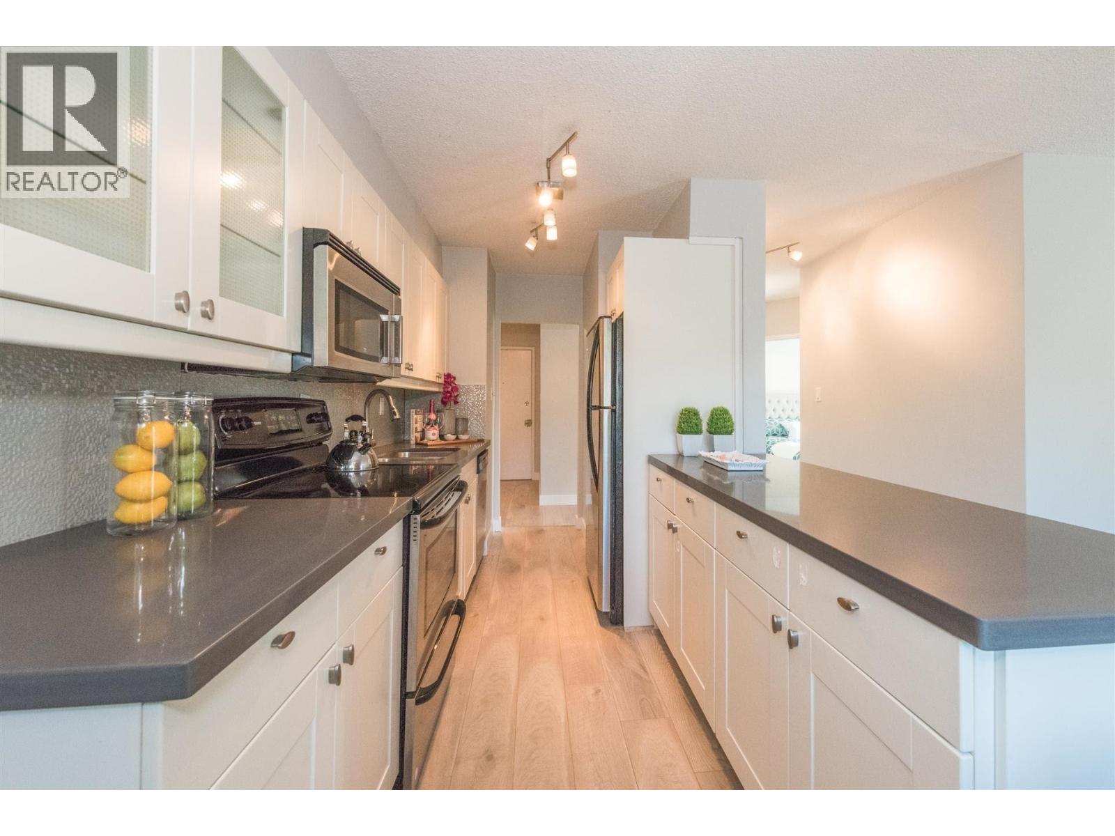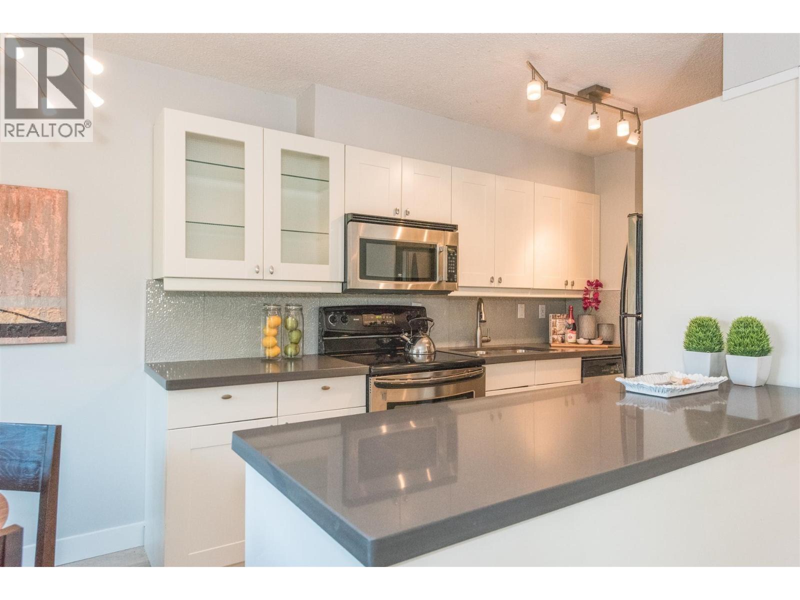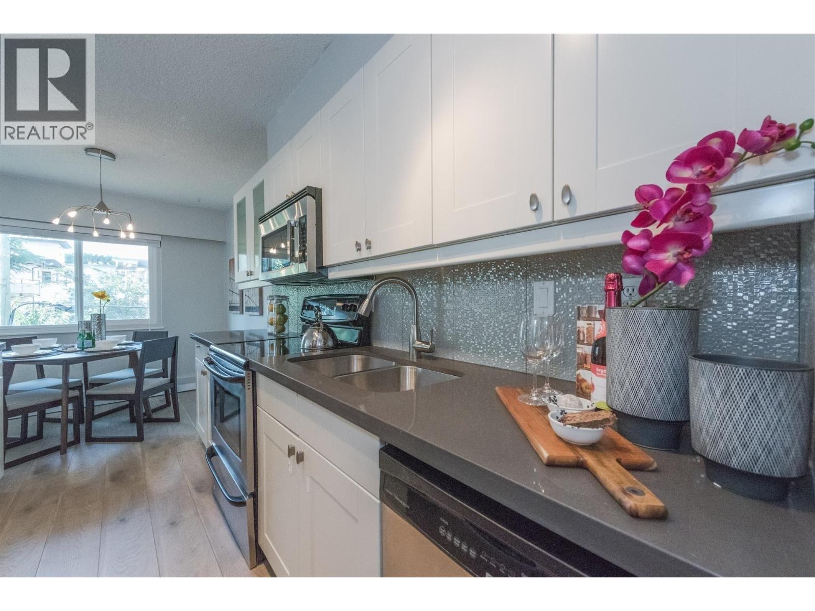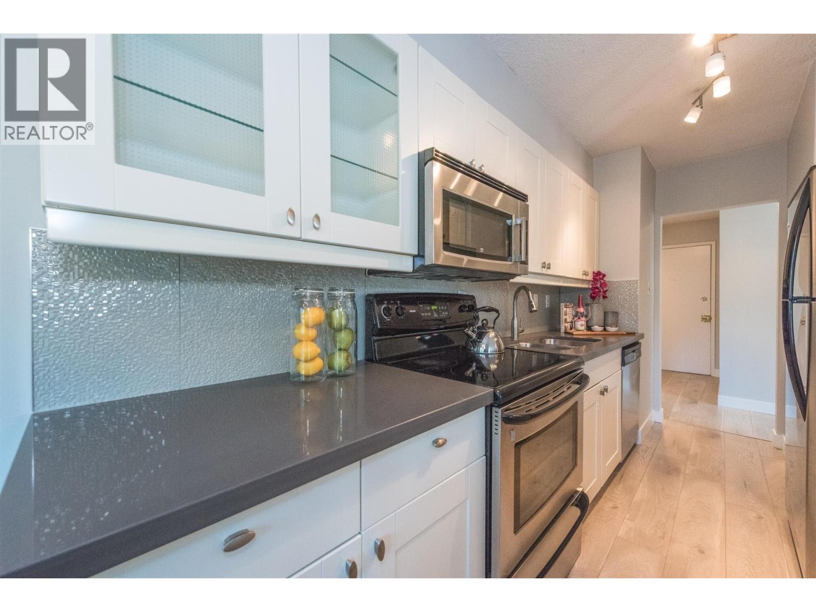 | Rarely available corner penthouse that is truly turn-key. Southeast-facing with a wraparound balcony and northern mountain views, this bright and spacious home features a functional open-concept layout with two generous bedrooms, a large living room, and a proper dining area. Tastefully renovated with laminate flooring, kitchen tile, quartz countertops, stainless steel appliances, an updated bathroom, and fresh paint throughout. Includes one storage locker and one parking stall. Pet- and rental-friendly building with a proactive strata. Major updates include roof (2001), piping (2000), boiler (2009), and windows/sliding doors (2012). Currently tenanted at $2,800/month; tenant leaving May 1, 2026. Open House: March 22, 2-4 PM. (id:5347) | |||