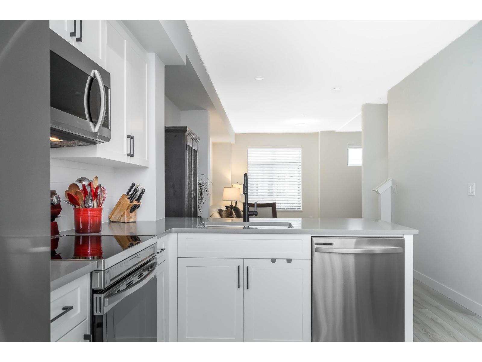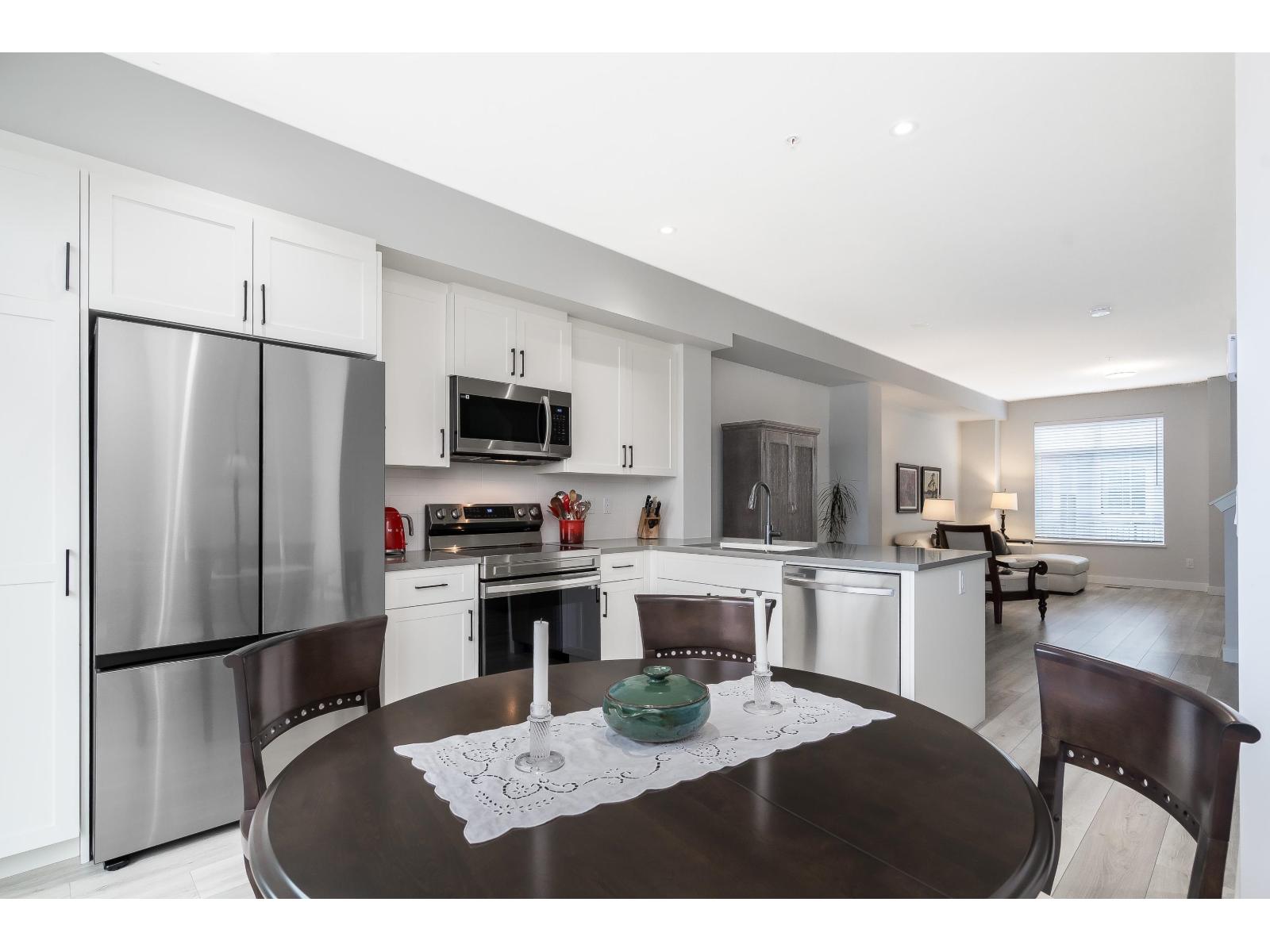 Chelsea built by VESTA! 3 bdrm 2 bath townhome in popular Willoughby neighborhood. Gently lived by ONE owner in like NEW CONDITION ! This home emanates pride in ownership! Featuring a spacious main floor w/ large kitchen, quartz counters, S/S appliances & eating nook, a large dining room area which over looks the living room offering a huge picture window w/lots of natural light. The upper floor boasts a lovely primary bdrm w/ 4 piece ensuite incl. quartz counters, undermount sink & large shower. Also 2 more bedrooms & main bathroom, laundry conveniently located on the upper floor. Other features incl a large deck off kitchen, oversize tandem garage, fenced yard, FORCED AIR heat. PLUS Josette Dandurand Elem. & Yorkson middle school close by! Balance of the 2-5-10 warranty remaining. (id:5347)