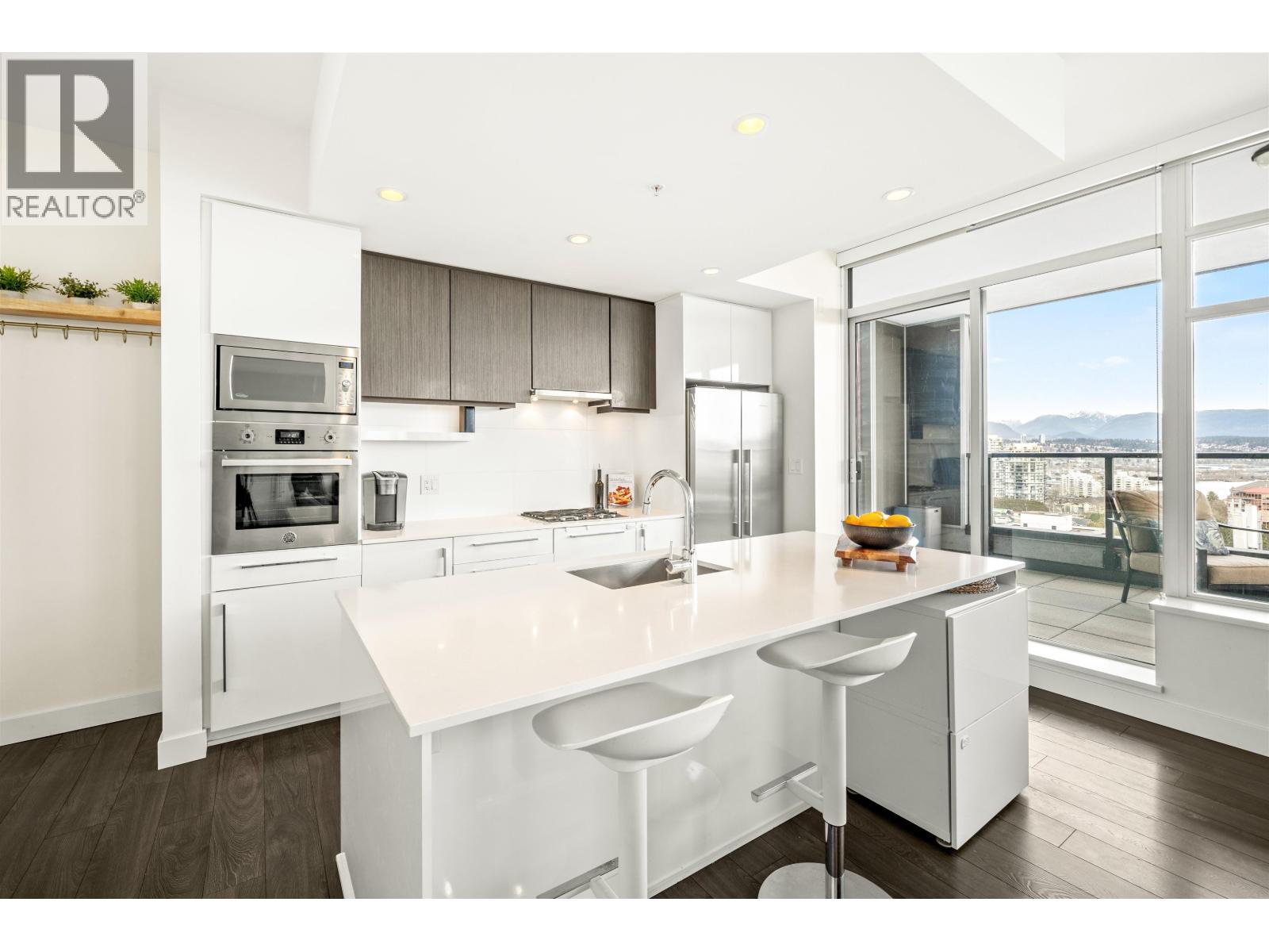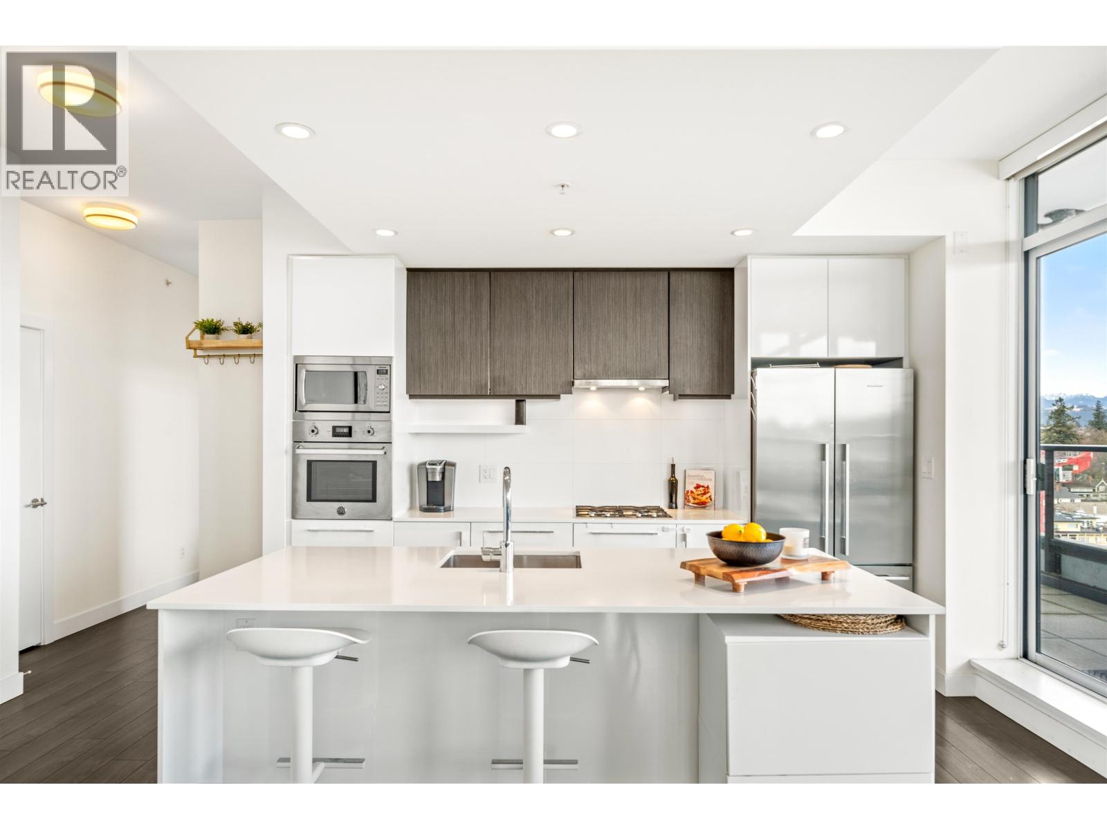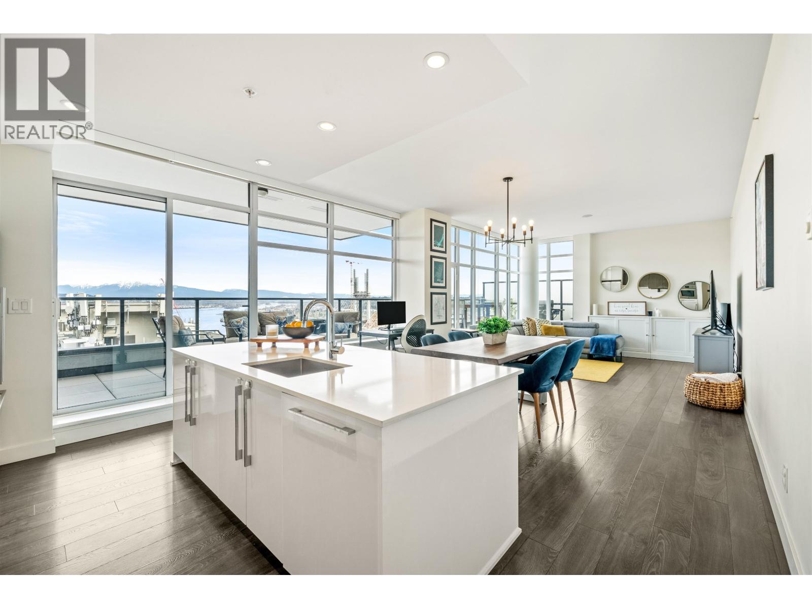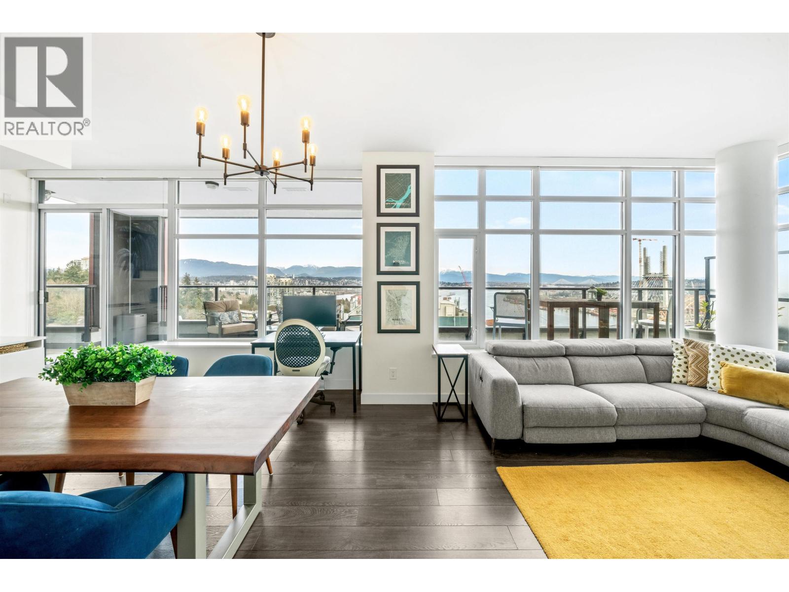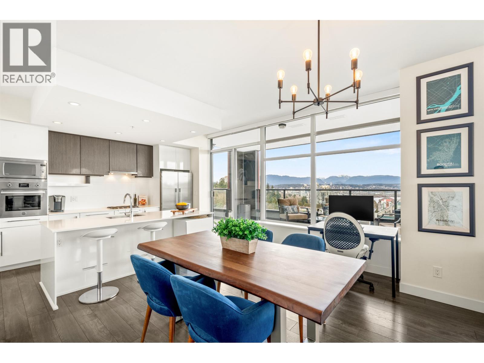 | Stunning sub-penthouse high above downtown New West, this corner unit at Elliot Street offers panoramic views from the North Shore mountains, to the Fraser River & Mt Baker. Huge wrap around semi-covered patio, great for entertaining, over 300sf, enjoy morning sunsets & north, east & south facing views! Open floor plan, 1,154sf of living space, with 2 bedrooms, 2 bathrooms, open-concept living/dining/kitchen area with 10´ ceilings, large kitchen with island, high-end European appliances, gas range, and modern cabinetry. Located on the east side of Downtown New West, backing onto Albert Crescent park, tucked away from city noise and a close walk to Columbia Skytrain, Restaurants, Shopping and Pier Park. Includes 1 parking & 1 storage. (id:5347) | |||