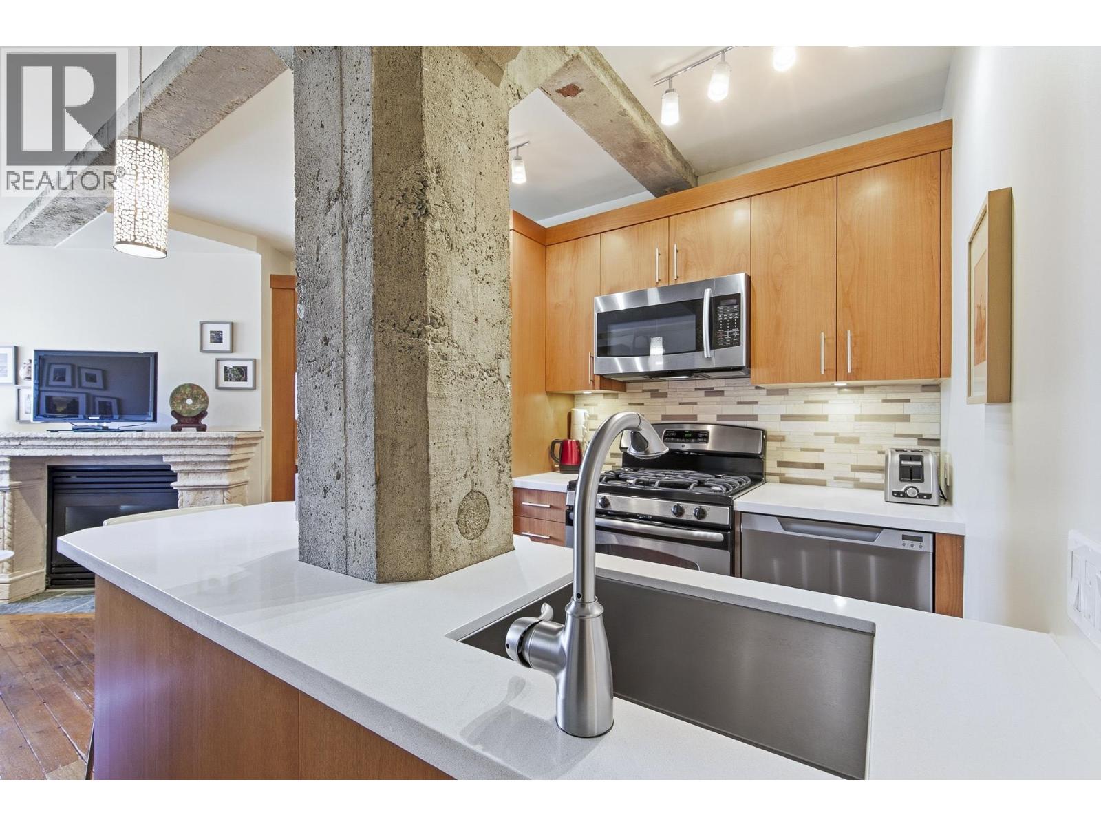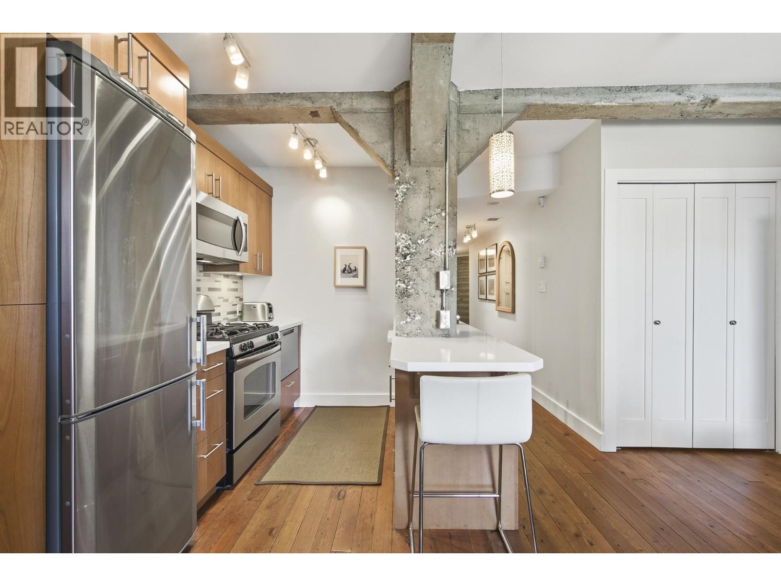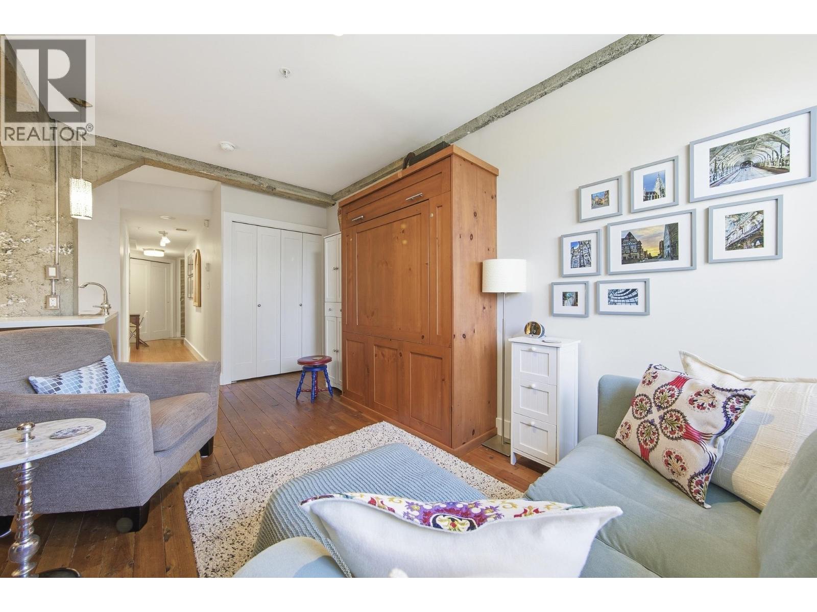 | If you've been looking for a studio in Yaletown this is the one! The Murchies a boutique heritage conversion building from 1912 that was converted into lofts in 1997. Open concept, beautiful reclaimed fir flooring from the original warehouse, exposed concrete beams and swing windows create light-filled magic. The cast stone fireplace set's the stage, the spacious kitchen and built in desk area are timeless. Multifunctional custom Murphy bed that also has a drop down table perfect for hosting. Common rooftop terrace with seating & bbq area. One storage locker, pet friendly. Steps to the Canada Line, the seawall and the finest shopping and dining Yaletown has to offer. This studio has been loved by it's current owner for 10 years and it's now time for it's next owner! (id:5347) | |||