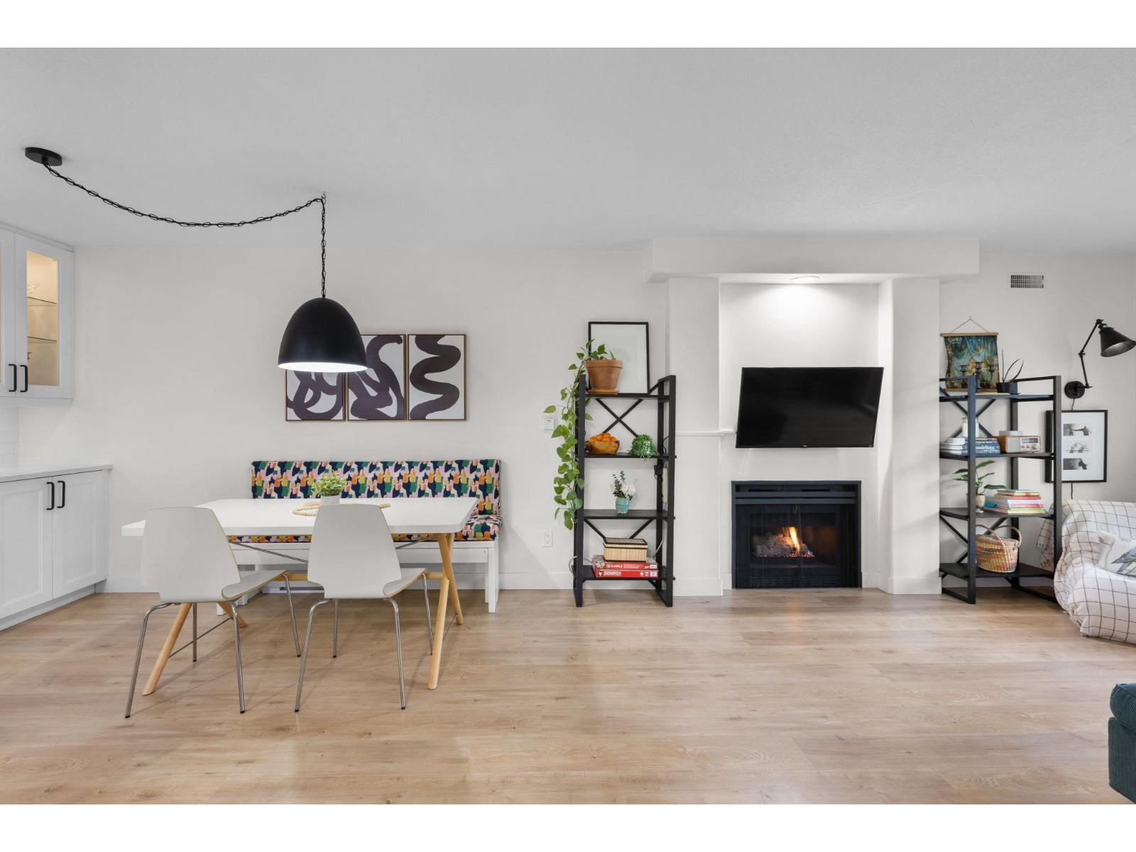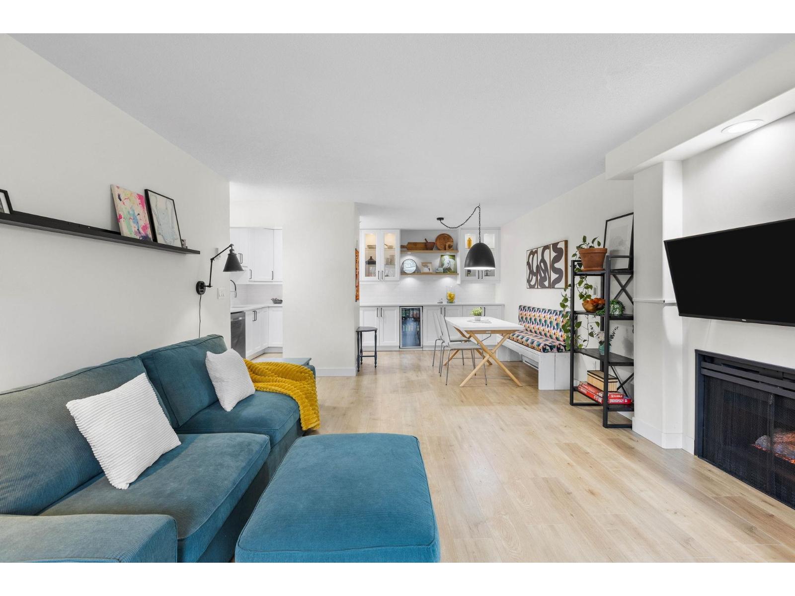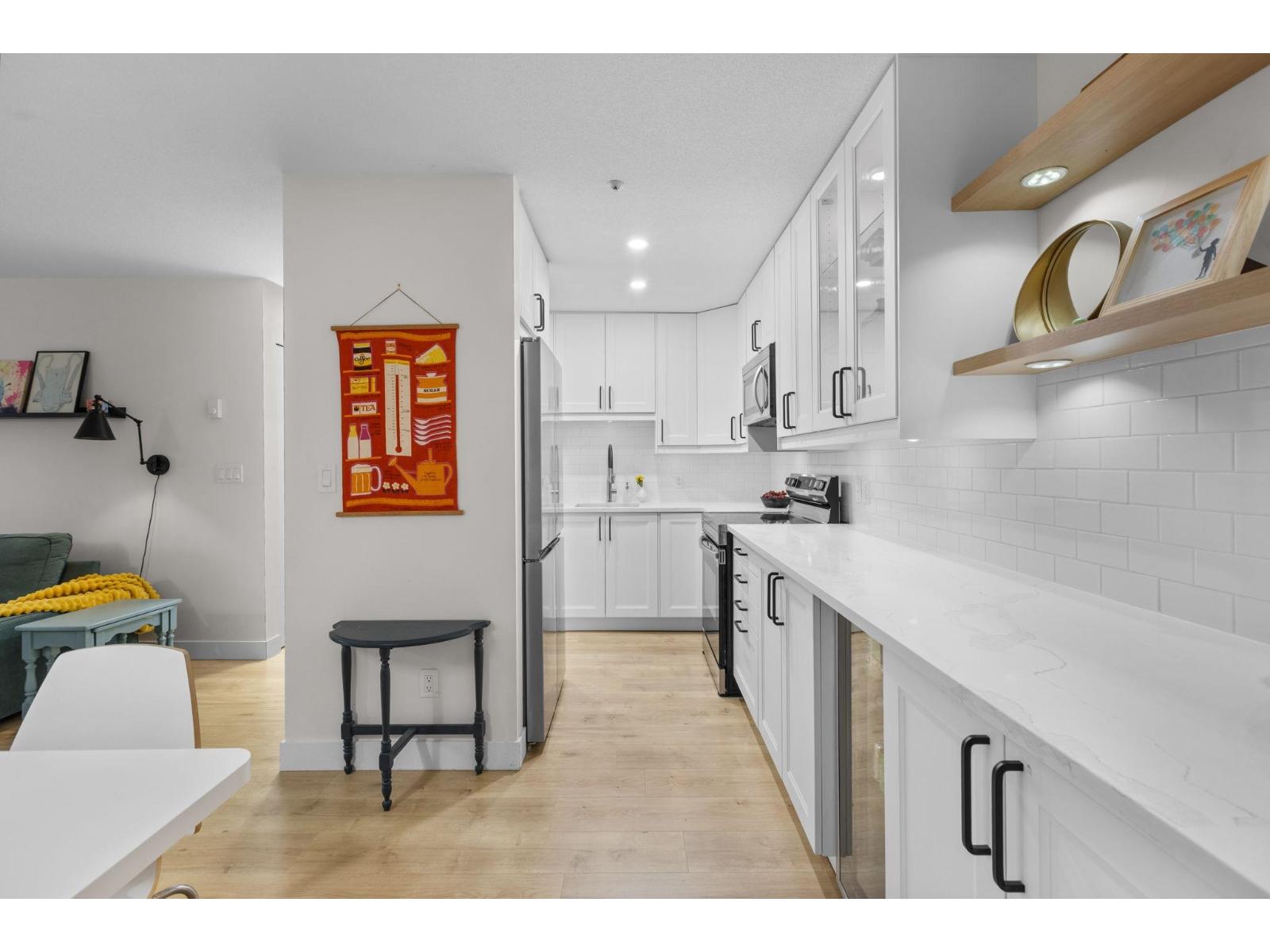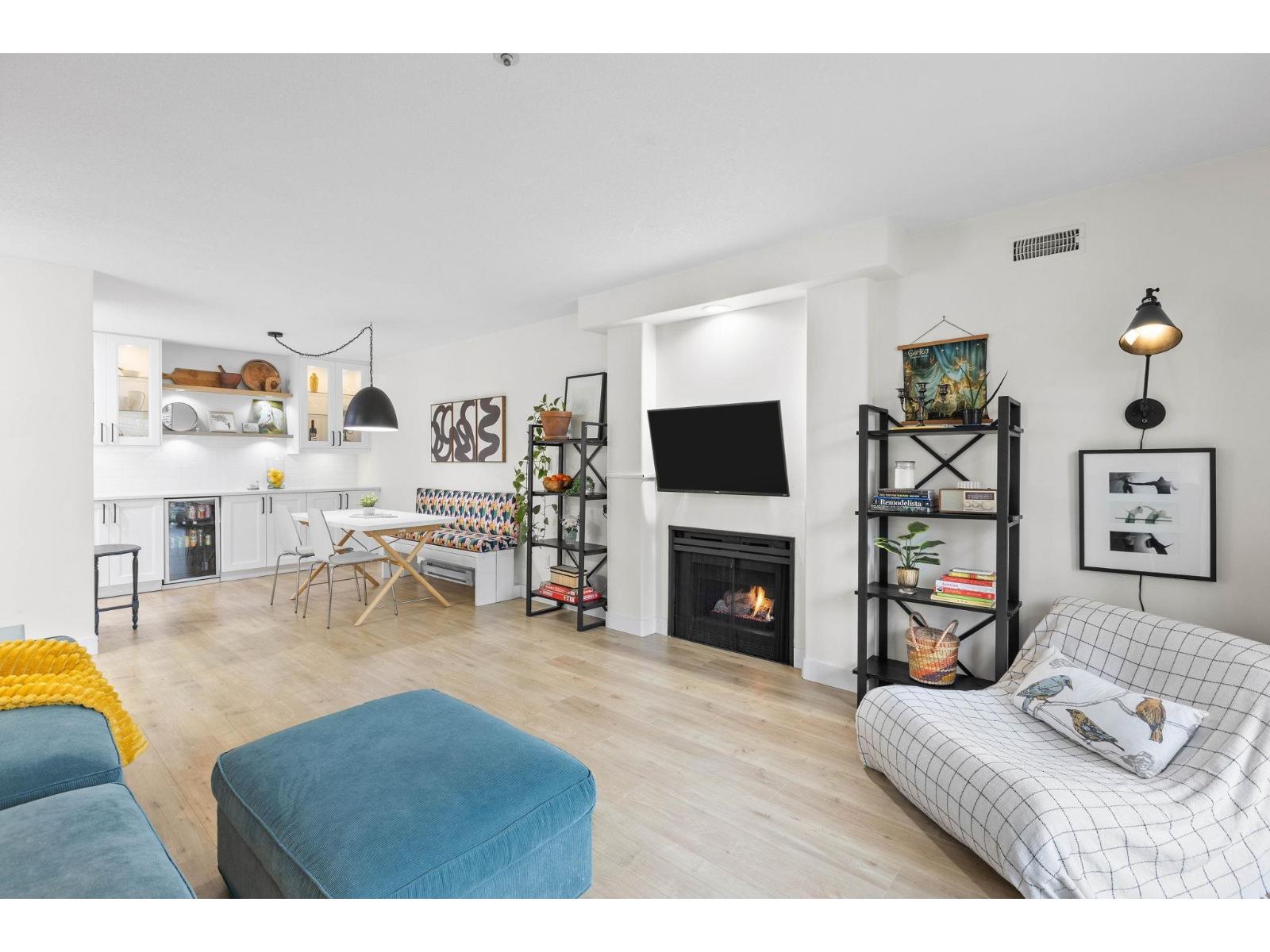 | Step inside and fall in love. This bright 2 bed, 2 bath corner suite has been thoughtfully upgraded. The kitchen shines with expansive quartz counters, a custom coffee bar with floating shelves and bar fridge, sleek white shaker cabinets with soft close doors and under mount lighting, plus stainless appliances including a 4 door fridge. Oak laminate flooring and custom lighting carries through the home for a warm, elevated feel. The open living and dining space is perfect for relaxing by the gas fireplace or stepping onto your sunny south facing balcony. Enjoy views of mature trees from every room. Both bathrooms feature quartz counters and deep soaker tubs. Full size laundry adds convenience. Seller is willing to offer a credit for 6 months of strata fees. (id:5347) | |||