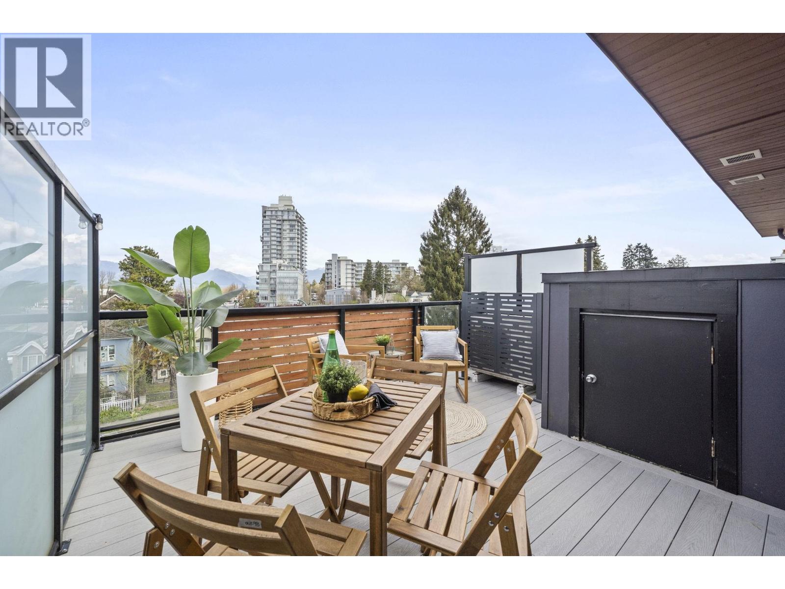 | Modern, sun-filled 3-bedroom townhouse offering over 1,200 sqft of thoughtfully designed living space plus an impressive 300 sqft of outdoor space across three decks. Recently refreshed with new paint, this home features a heat pump for year-round comfort with A/C, an open-concept kitchen with a pantry closet, flowing seamlessly into a dedicated dining area and a bright, airy living room that opens onto a BBQ balcony. All 3 bedrooms are generously sized, while the upper level showcases two expansive rooftop decks-one south-facing for all-day sun and the other northwest-facing with stunning mountain views. Includes one EV-ready parking stall, storage on the deck, plus two exterior storage areas. Ideally situated close to transit, amenities and schools for the ultimate convenience. (id:5347) | |||