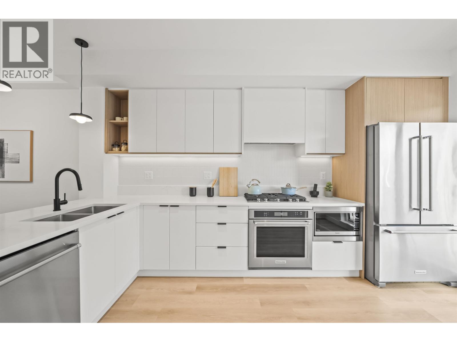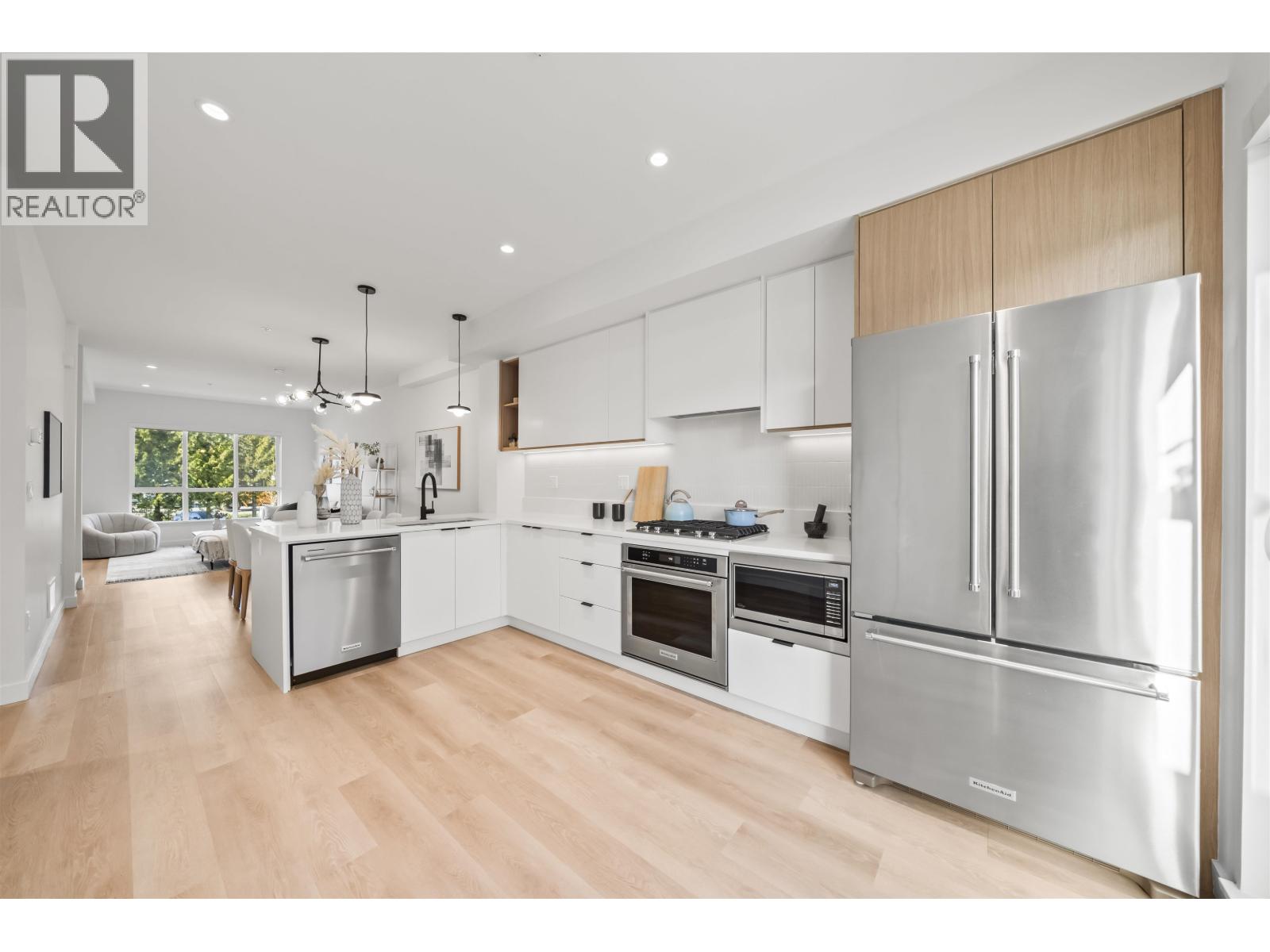 | Welcome to Mercer Village, New Westminster´s most anticipated master-planned community. This MOVE-IN READY 3-bed, 3-bath townhome is designed for functional, family living. The main level features 9´ ceilings with pot lights, luxury vinyl plank flooring, a powder room, pantry, and a 6' kitchen peninsula for entertaining. The kitchen includes a full-size 36" fridge, 5-burner gas cooktop, wall oven, and 3-rack dishwasher. Enjoy a balcony with BBQ gas bib, patio with hose bib, tandem garage with Level 2 EV outlet, and driveway apron for a 3rd vehicle. Upstairs offers 3 bedrooms and 2 spa-inspired bathrooms with floating vanities and terrazzo tile. Unit 144 is the DARK colour scheme. Low strata fees and pet-friendly. Visit our Presentation Centre at 260 Ewen Ave to tour. (id:5347) | |||